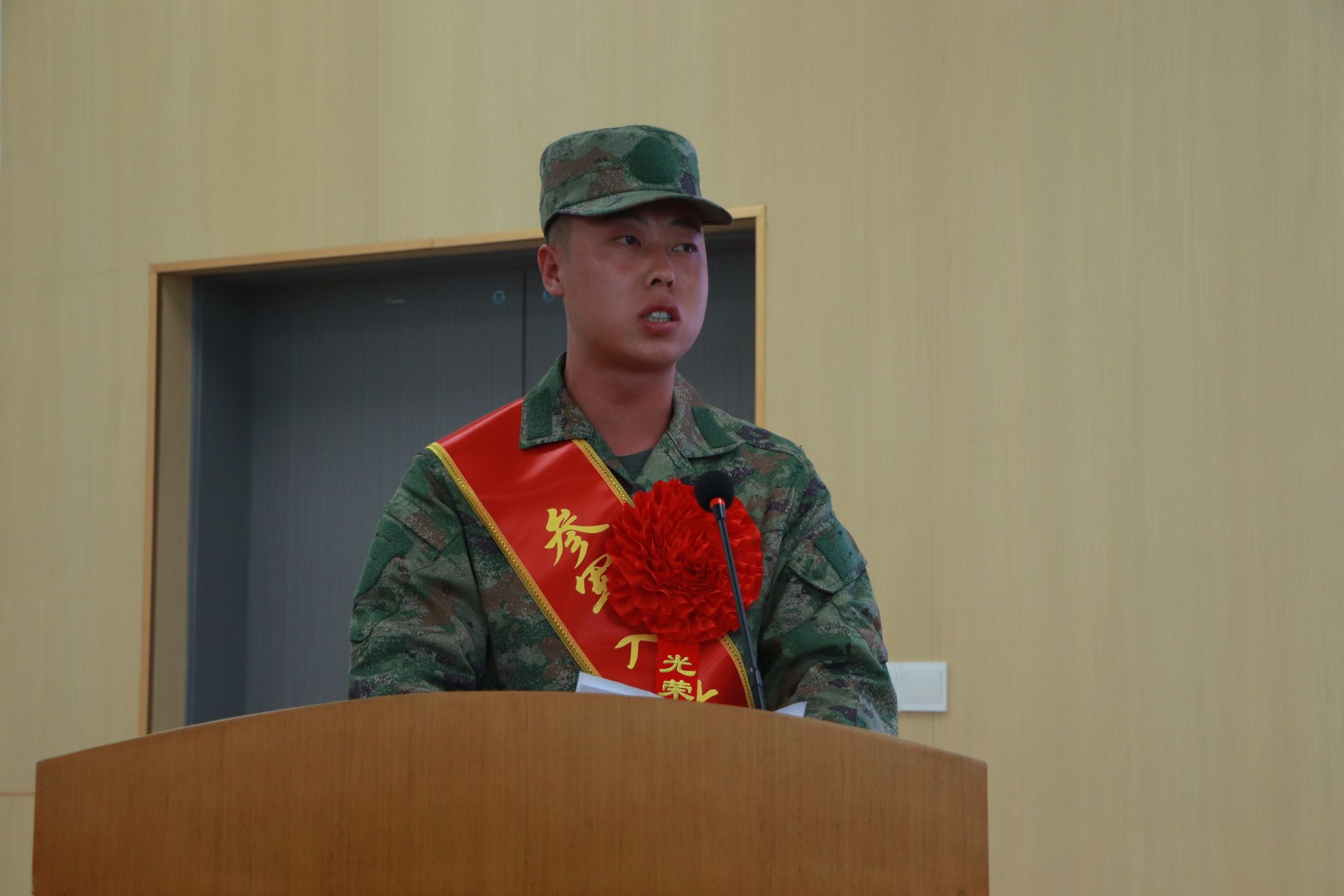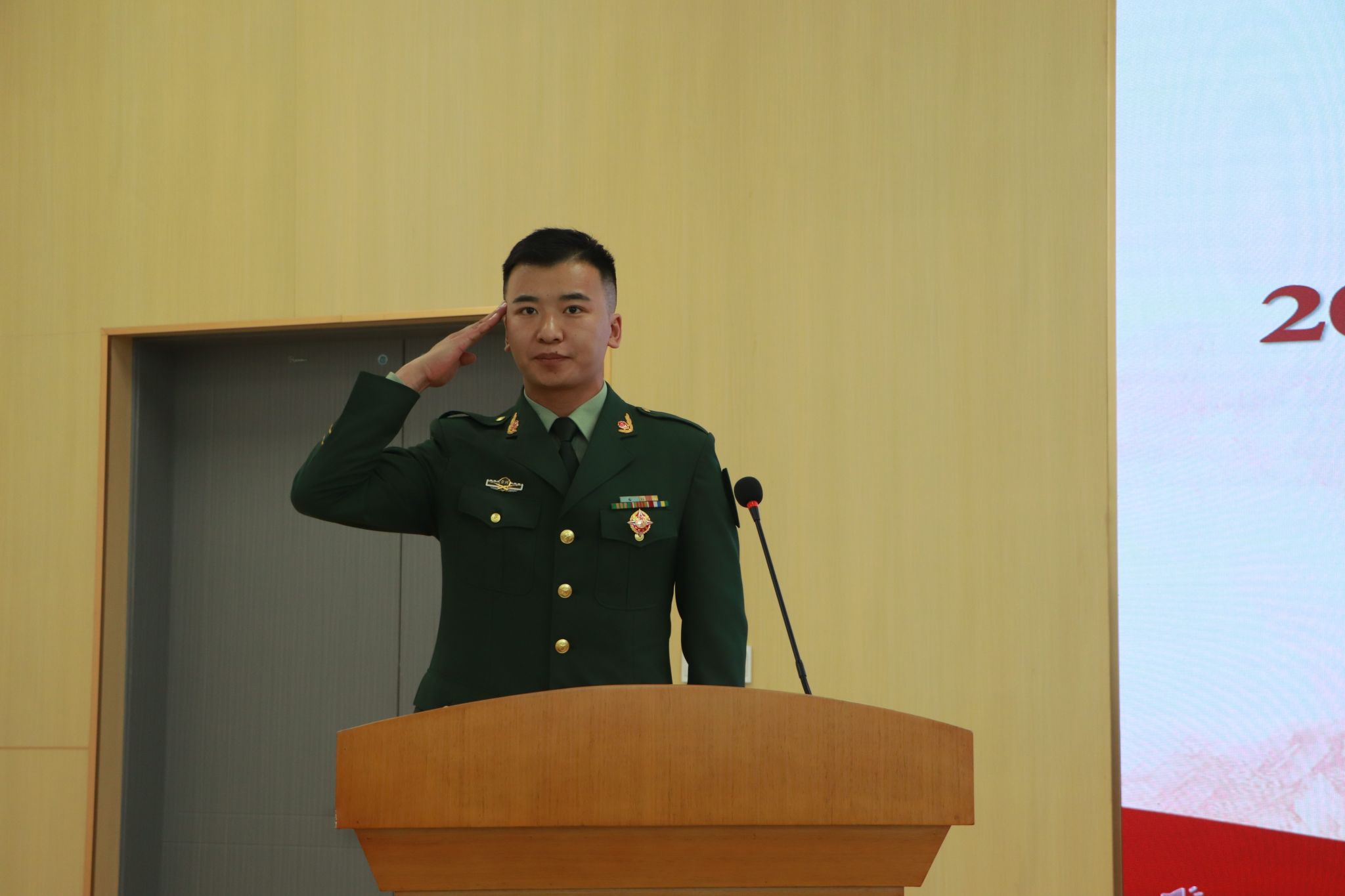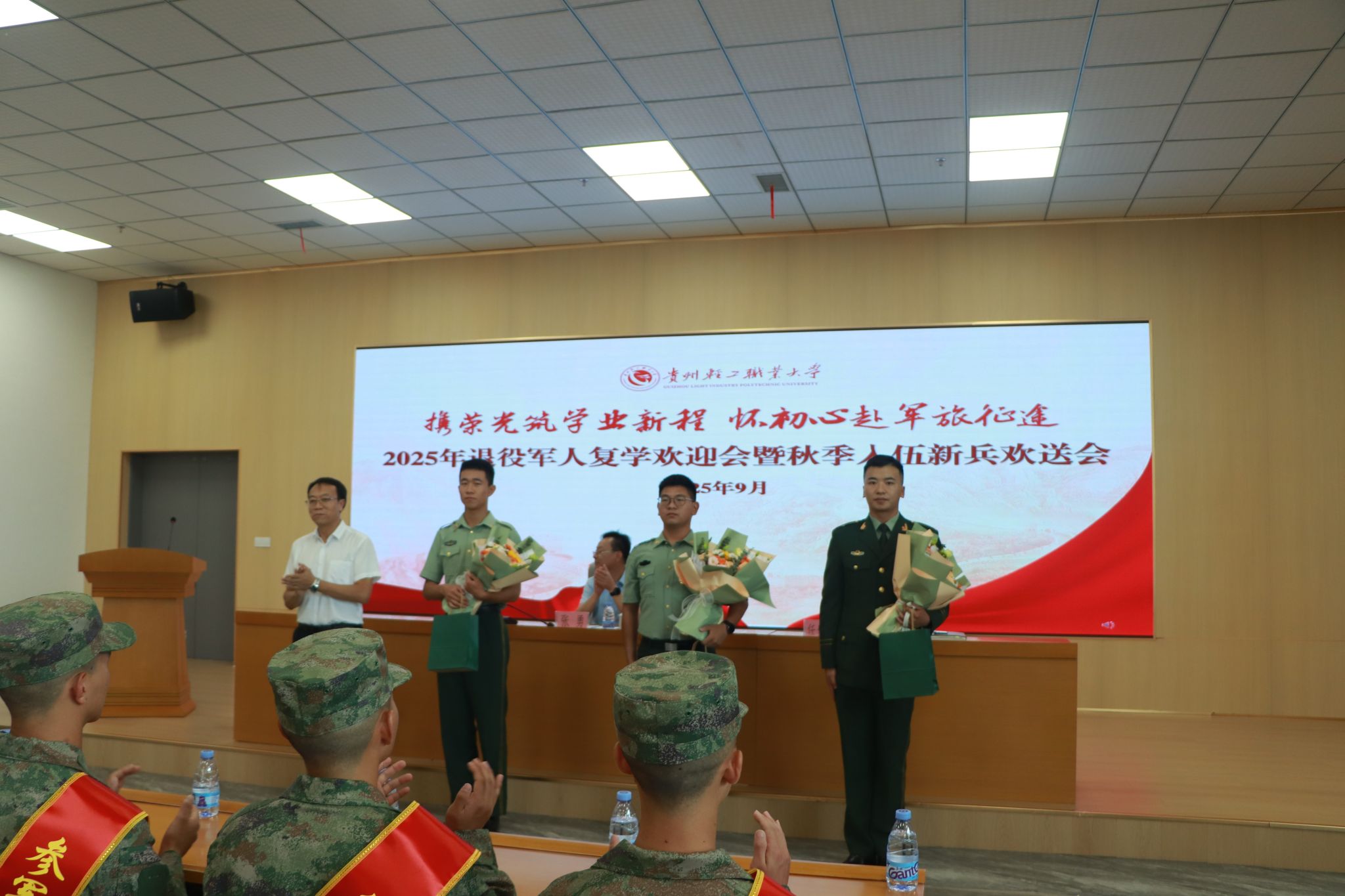 活动在庄严的国歌声中拉开序幕。活动现场,与会领导为学校2025年退役复学军人代表颁发纪念品,为入伍新兵代表颁发“从戎之剑”。轻工化工系宋邦童同学代表退役复学军人发言,回顾了军旅岁月,讲述从军故事,表达了退役复学后践行技能报国的信心和决心;经济管理系二次入伍学生李爱爱同学代表入伍新兵发言,感恩学校无私培养和关心关爱,表达了青年学子建设国防、矢志报国的壮志豪情。