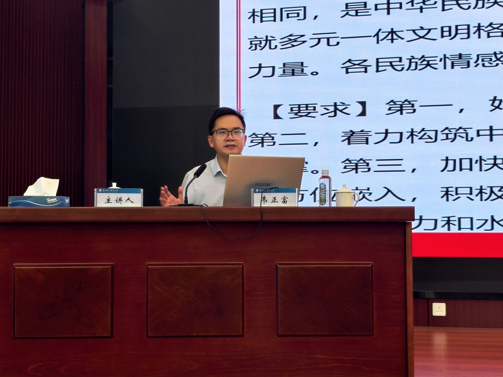 韦正富教授从“准确把握中华民族共同体的基本概念,深刻认识铸牢中华民族共同体意识的重大意义,深入理解铸牢中华民族共同体意识的理论渊源,准确把握铸牢中华民族共同体意识的深刻内涵,重点深化铸牢中华民族共同体意识的基本任务,始终坚持党的全面领导是铸牢中华民族共同体意识的根本保证”六个方面为学校师生作了全面深入的解读阐释,通过理论阐释与情感共鸣相结合的方式,进一步增强了师生对中华民族共同体的理性认知和情感认同。与会师生纷纷表示,将以此次宣讲为契机,从自身做起,为促进校内各民族师生交往交流交融贡献力量,共同绘就中华民族伟大复兴的壮美画卷。