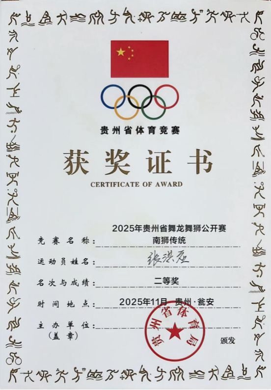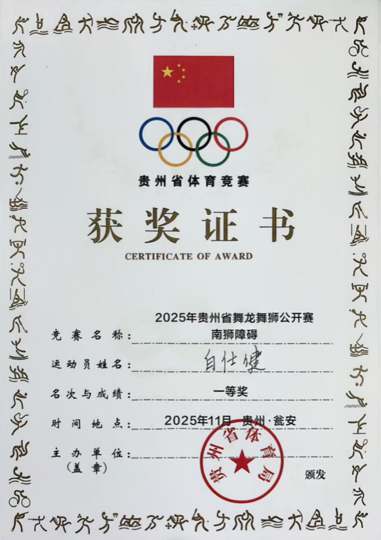 11月22日-23日,我校国旗护卫队(龙狮队)参加贵州省体育局举办的“2025年贵州省舞龙舞狮公开赛”,荣获南狮障碍项目一等奖、南狮传统项目二等奖、南狮竞速项目三等奖,获南狮团体项目第二名。
