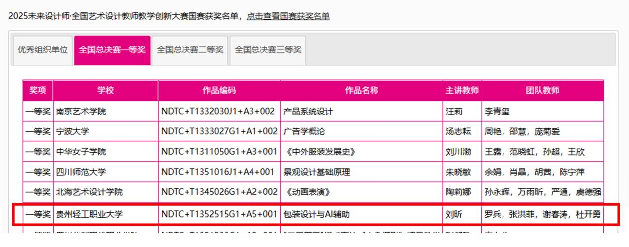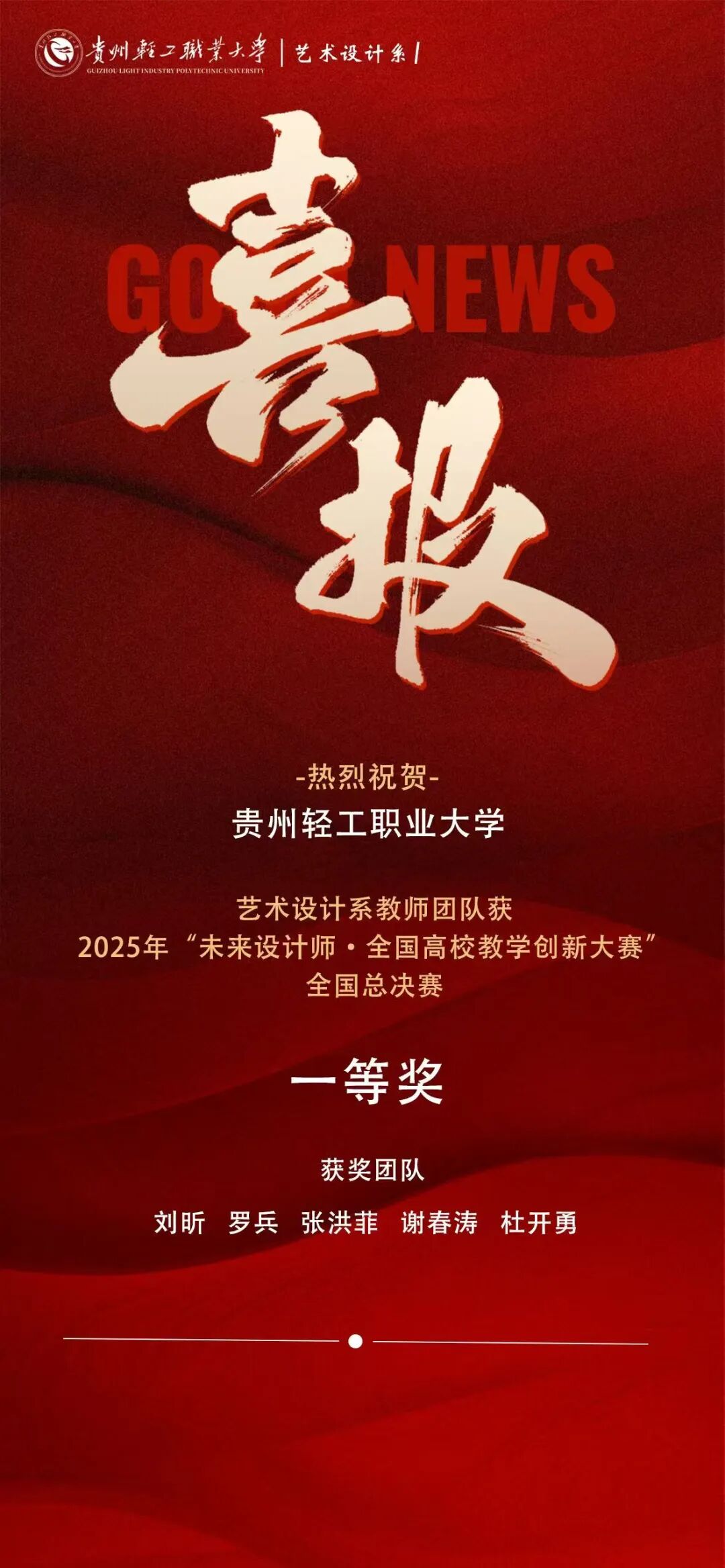 近日,2025年“未来设计师·全国高校教学创新大赛”全国总决赛顺利落下帷幕。贵州轻工职业大学艺术设计系刘昕教师团队凭借参赛作品《包装与AI辅助》荣获全国一等奖,充分展现了学校在艺术设计教学创新方面的扎实实力与育人成效。