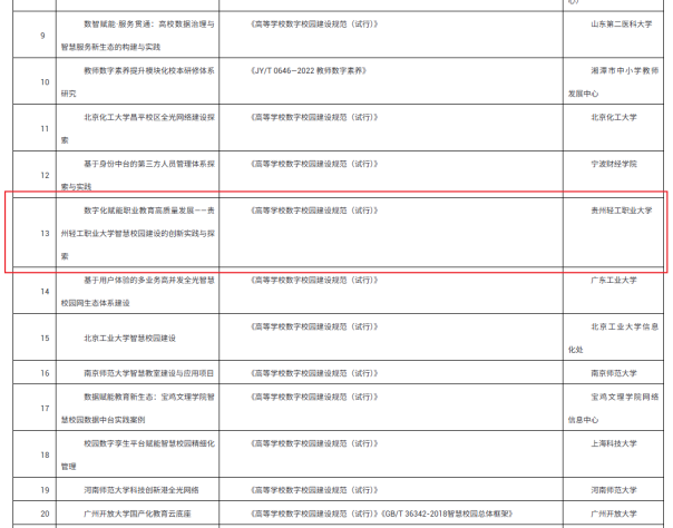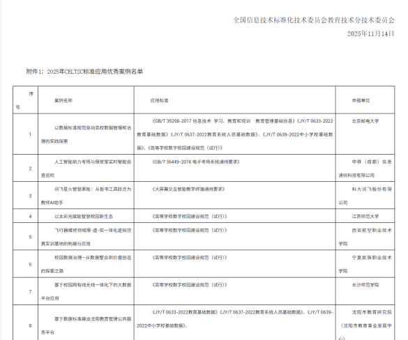 近日,全国信息技术标准化技术委员会(CELTSC)正式公布了“2025年标准应用优秀案例”评选结果。贵州轻工职业大学申报的《数字化赋能职业教育高质量发展——智慧校园建设的创新实践与探索》项目成功入选,成为全国获评的30项优秀案例之一,也是贵州省本次唯一入选的案例。这是学校在职业教育信息化建设领域的一项突破性成果。