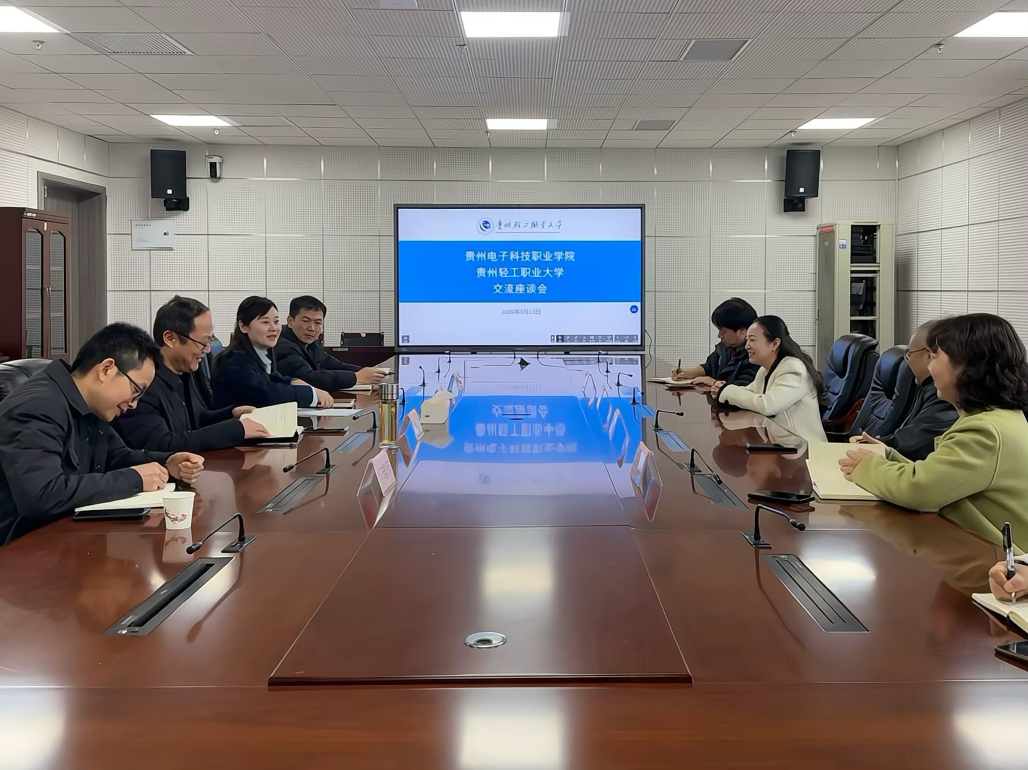 为加强校际合作,共享办学经验,共同推动社会服务事业高质量发展,2026年3月11日,贵州电子科技职业学院副院长毛志伟率职业技能鉴定所主任陈文庆、规划财务处处长姜晓燕等一行5人到我校座谈交流。