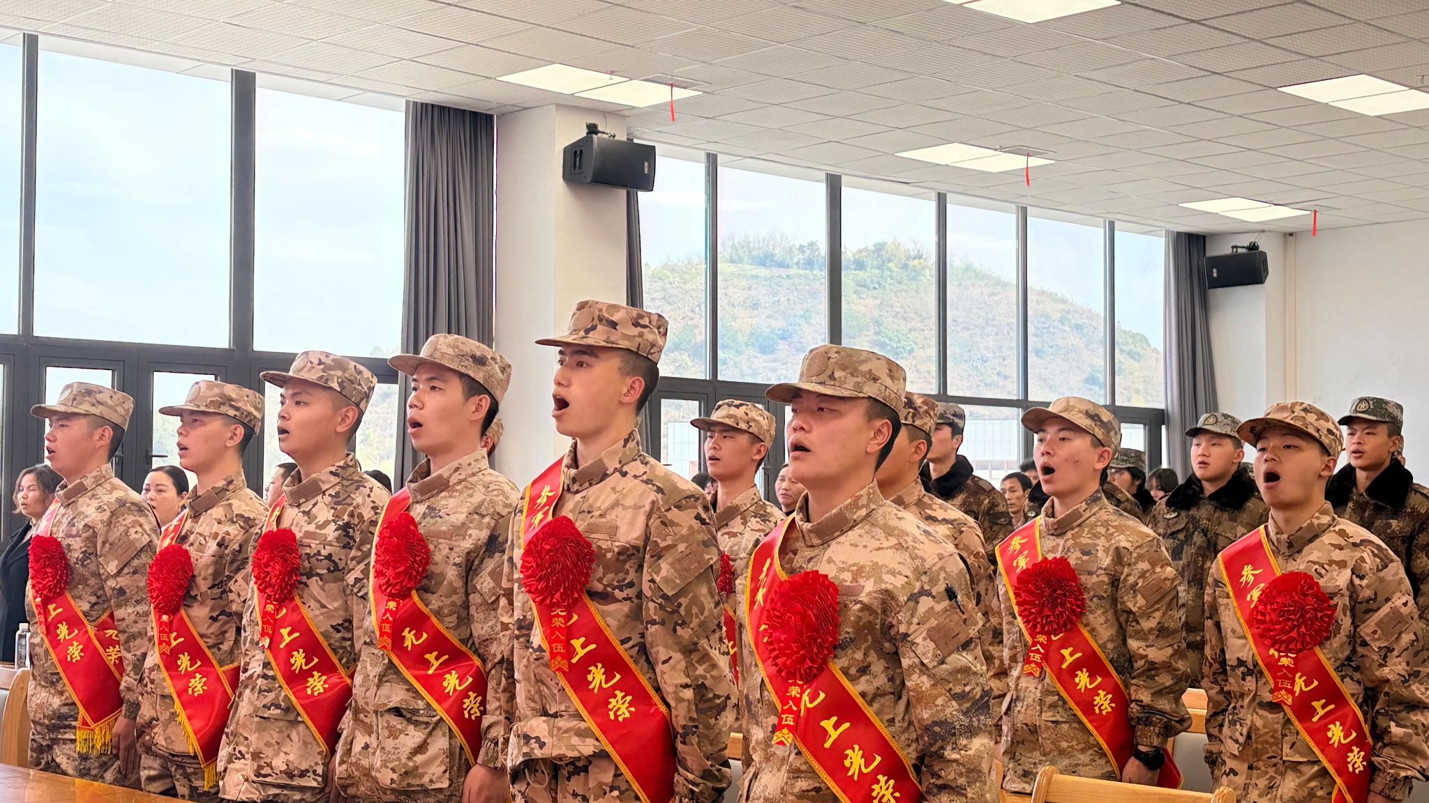 伴随着庄严雄壮的国歌,欢送会正式拉开帷幕。与会领导为入伍新兵代表颁发纪念品——“从戎之剑”。入伍新兵代表、建筑工程系学生王国毅同学发言,他深情感恩学校的悉心培养与师长的关心关爱,表达了投身军营、矢志报国的坚定决心与壮志豪情,展现了新时代贵轻大学子的责任与担当。