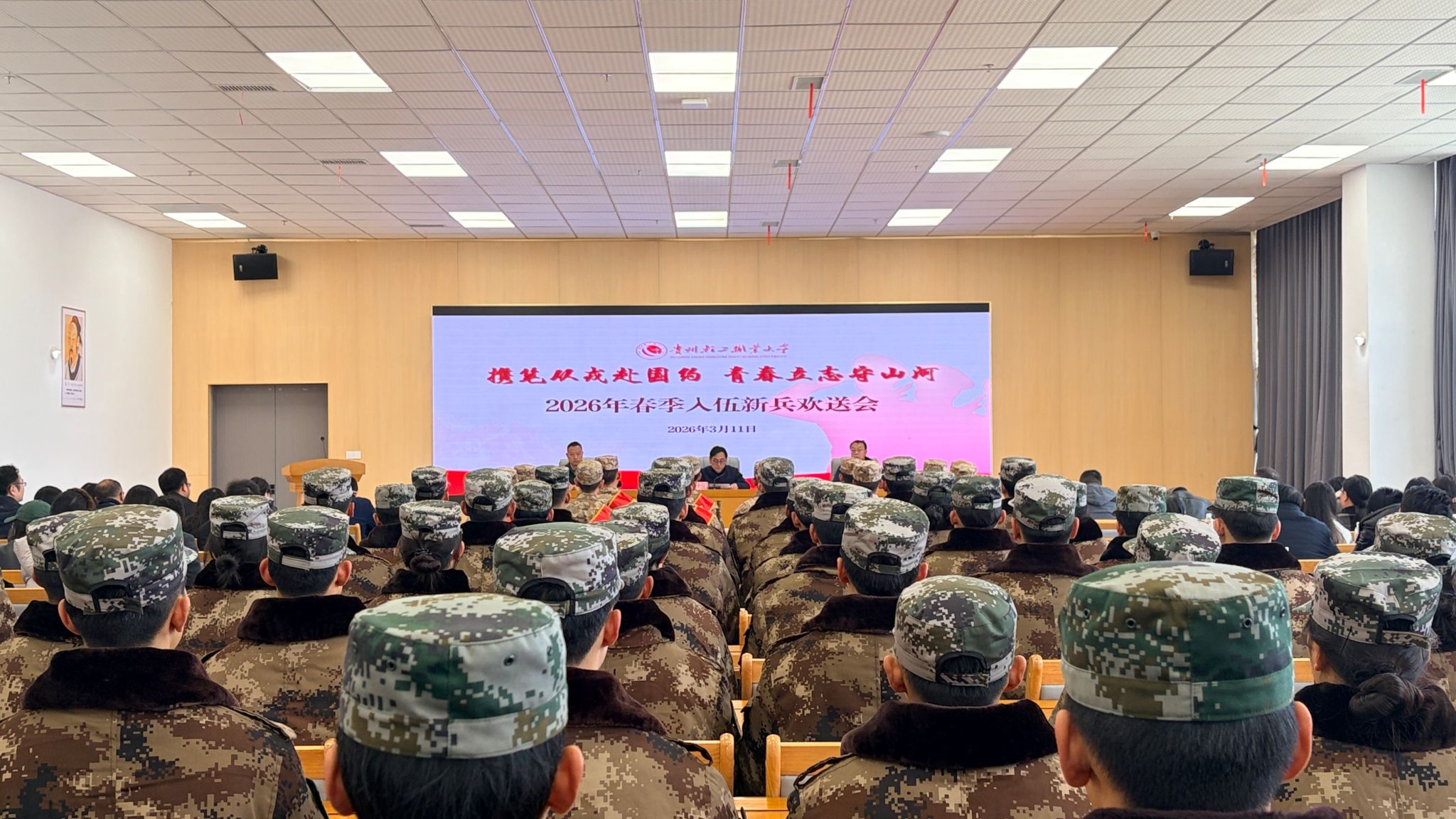 3月11日,学校在学生事务服务中心组织召开2026年春季入伍新兵欢送会。学校党委副书记、校长杨天仪出席并讲话。花溪区人民武装部副部长龙程出席欢送会。党委学生工作部(武装部)相关工作人员,各系党总支书记、副书记,国际学院分管学生工作副院长,各系(院)征兵工作负责人、入伍新兵所在班级辅导员,入伍新兵代表、家长代表及学校国旗护卫队全体成员参加欢送会。