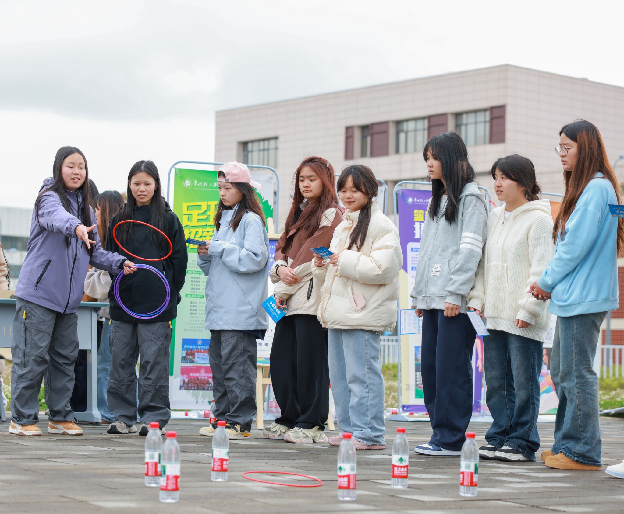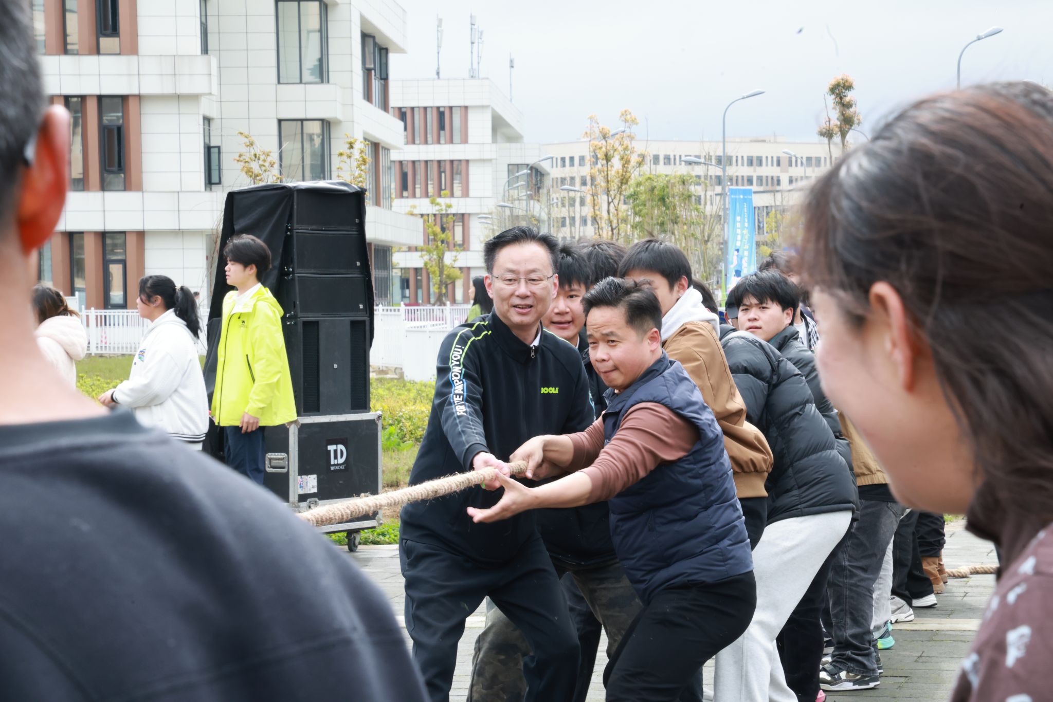 趣味活动现场更是精彩纷呈,团体项目与个人项目各有乐趣,处处洋溢着欢声笑语。拔河、趣味毛毛虫、袋鼠跳接力等团体项目中,各教学单位代表队默契配合、奋勇拼搏,参赛队员们凝心聚力、啦啦队的呐喊助威声此起彼伏,赛场上下连成一片,将团队协作的精神展现得淋漓尽致;套圈、小型保龄球、蛋跑、夹弹珠等个人项目趣味十足,吸引了众多师生参与,在轻松愉悦的氛围中体验运动乐趣。