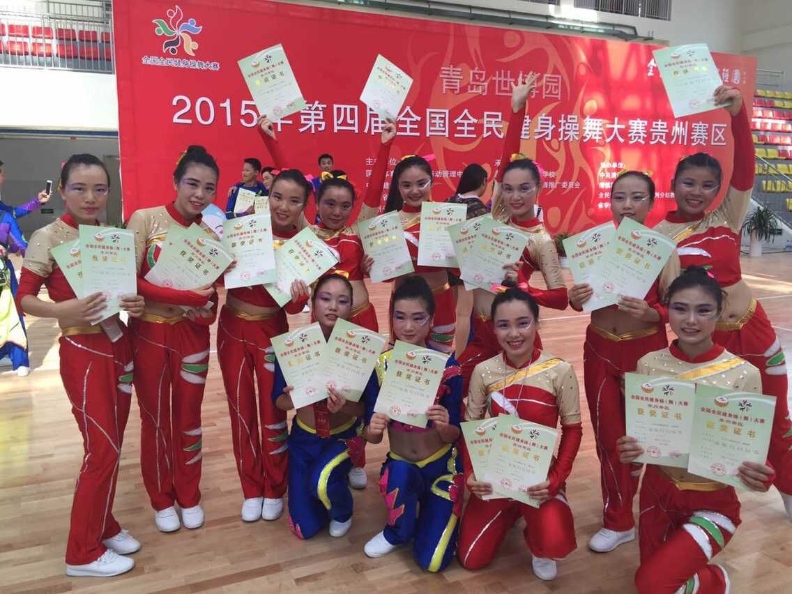 7月15至16日,由省教育厅、省体育局主办的2015年第四届全国全民健身操舞大赛贵州赛区比赛在贵州省机械工业学校举行,经过激烈角逐,我院健美操队在普通院校组有氧健身操舞第三套大众锻炼标准2级、3级两项比赛中均荣获一等奖。