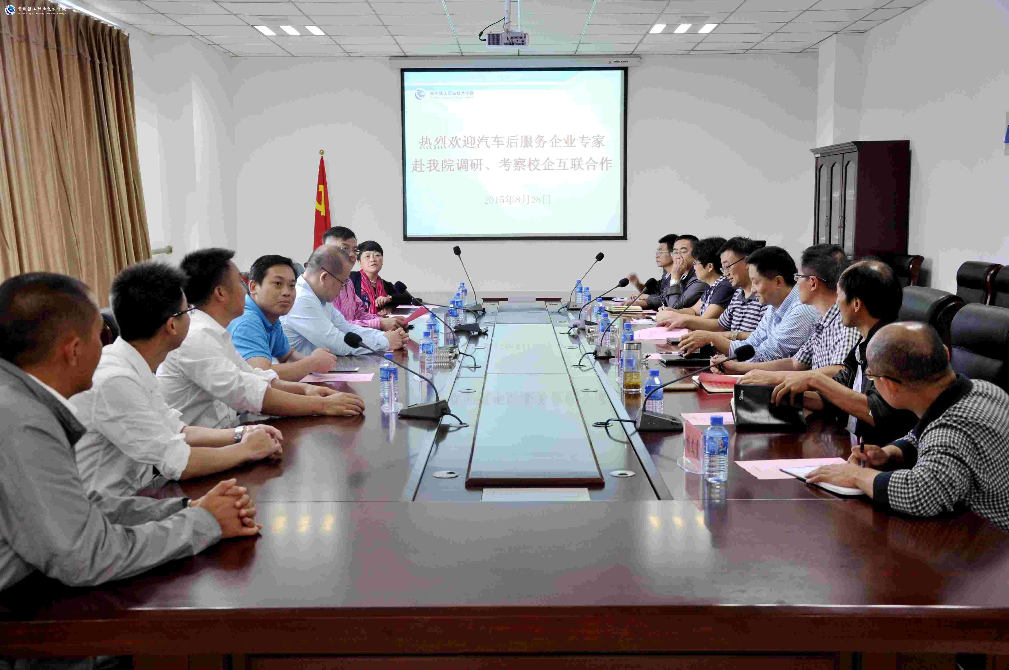 8月28日下午,卡泰克(中国)总裁厉博特、联众精车总经理杜小龙,汽车服务世界总经理胡军波,联众精车总经理助理伍振中,贵阳汽车工业学校校长李沁等一行八人赴贵州轻工职业技术学院调研、考察校企互联合作事宜。学院院长周杰,党委副书记冯其毅,副院长陈秀娟、何亚平,院党委委员(党政办主任)孟永国,机电工程系主任王国安,中职部主任(招就办副主任)杨力伦,招就办副主任杨文通参加会议。