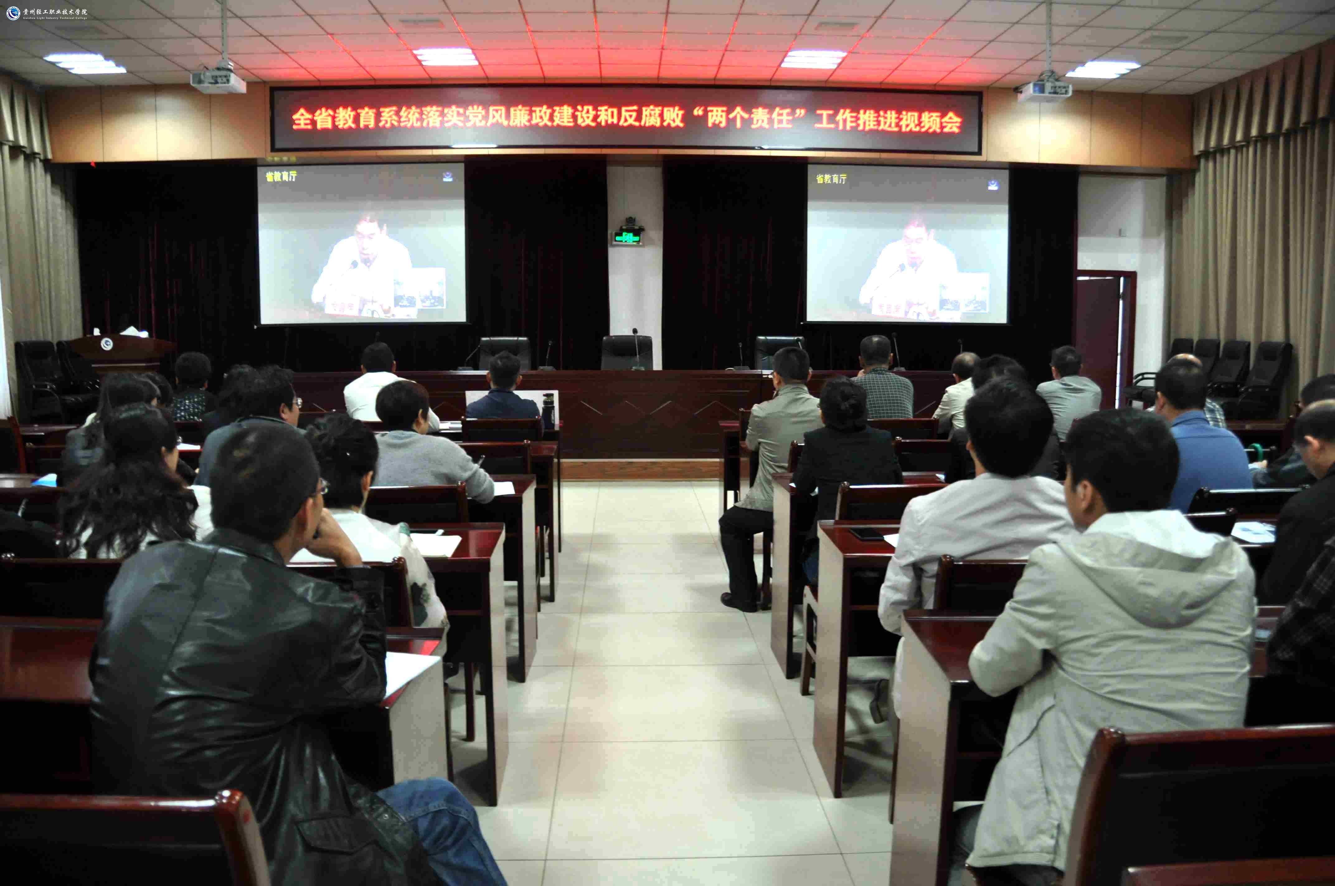 为进一步加强党风廉政建设和反腐败工作,9月25日上午9点省教育厅召开全省教育系统落实党风廉政建设和反腐败两个责任工作推进视频会议,主会场设在省教育厅。根据会议通知要求,我院在行政楼五楼会议室设立分会场。学院党委书记卢亚莲在主会场参会。学院院长周杰率学院班子其他成员,院机关各部门负责人等在分会场参会。主会场会议由省教育厅党组成员、省委教育工委副书记赵廷昌主持。