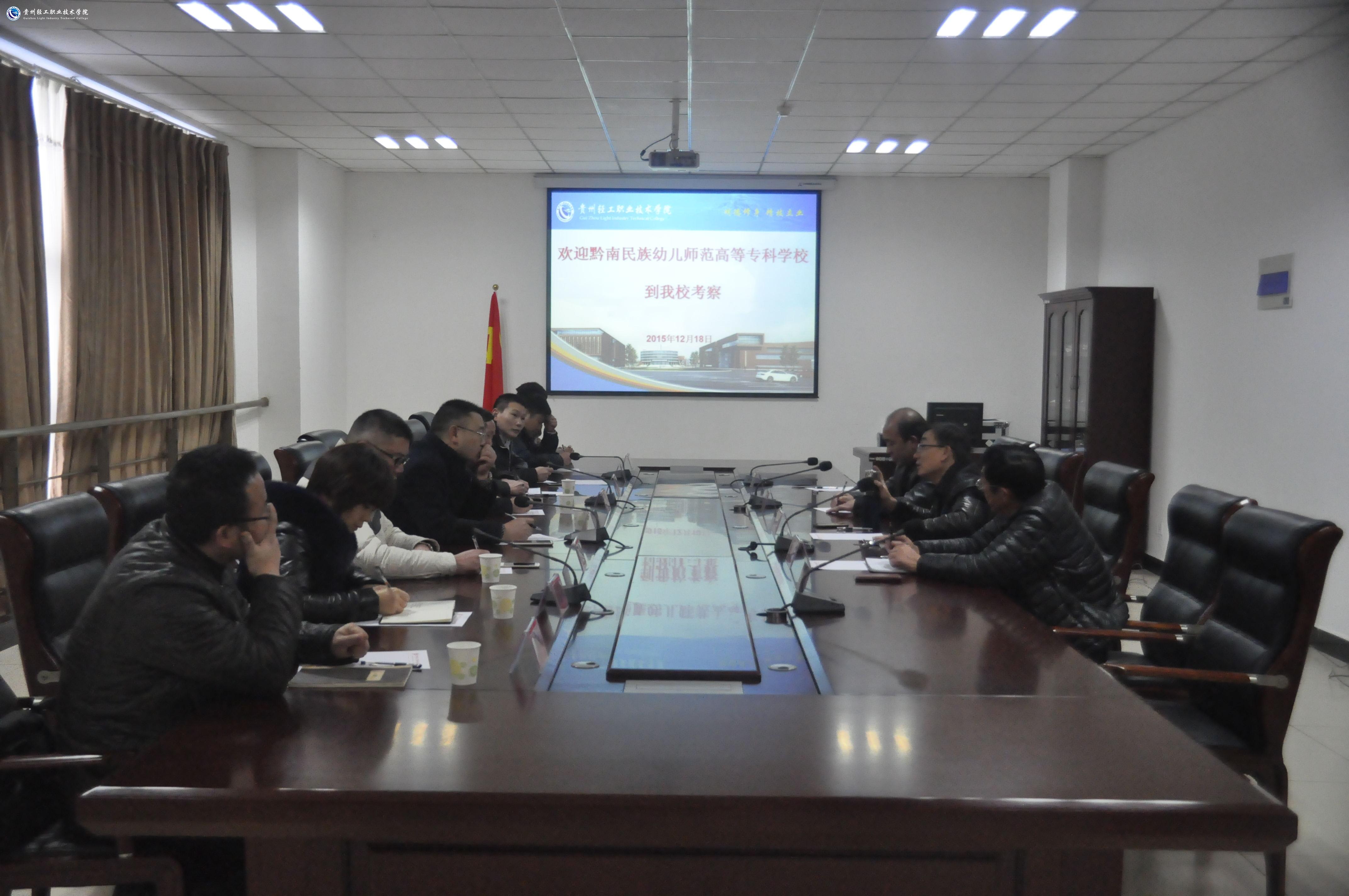 12月18日上午,黔南民族幼儿师范高等专科学校校长刘荣鹏率学院相关领导干部十余人赴我院参观考察,学院院长周杰、副院长刘天德、党政办公室主任孟永国陪同参观考察。