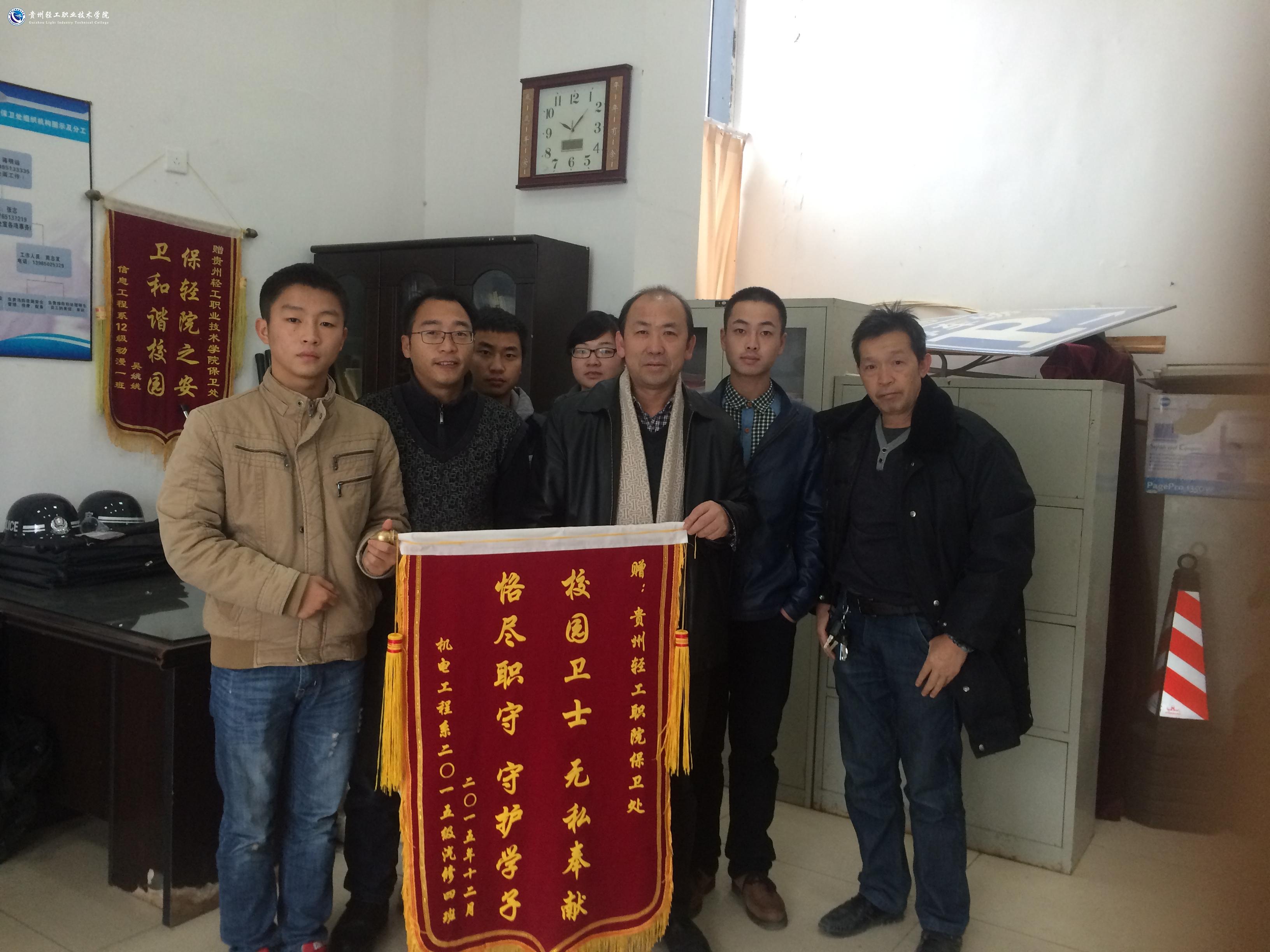 12月25日早上10点,机电工程系2015级学生丁宇杰在班委的陪同下将一面写有“校园卫士、无私奉献、恪尽职守、守护学子”的锦旗送到了学院保卫处,并不停的道着“感谢、感谢”。