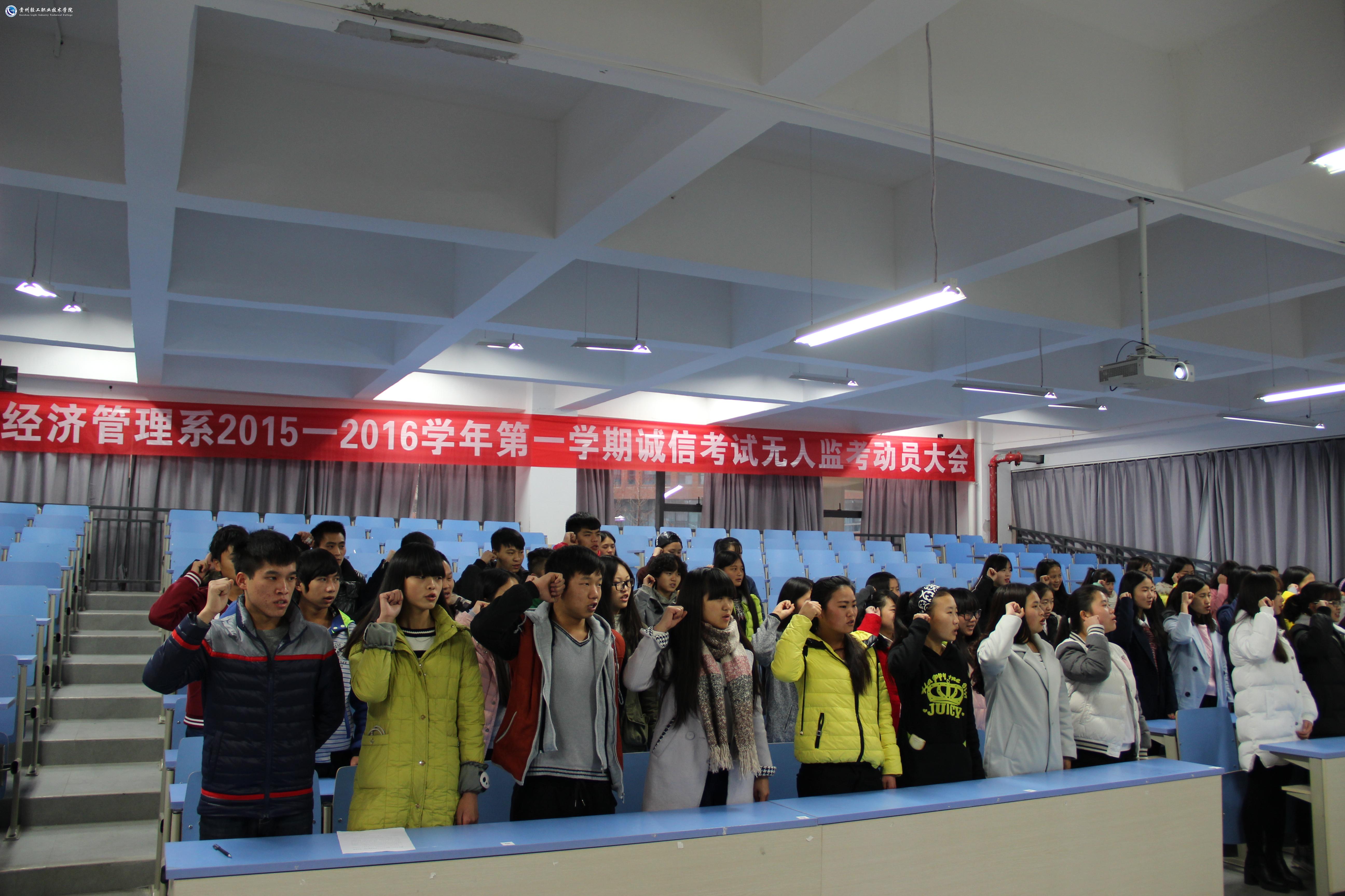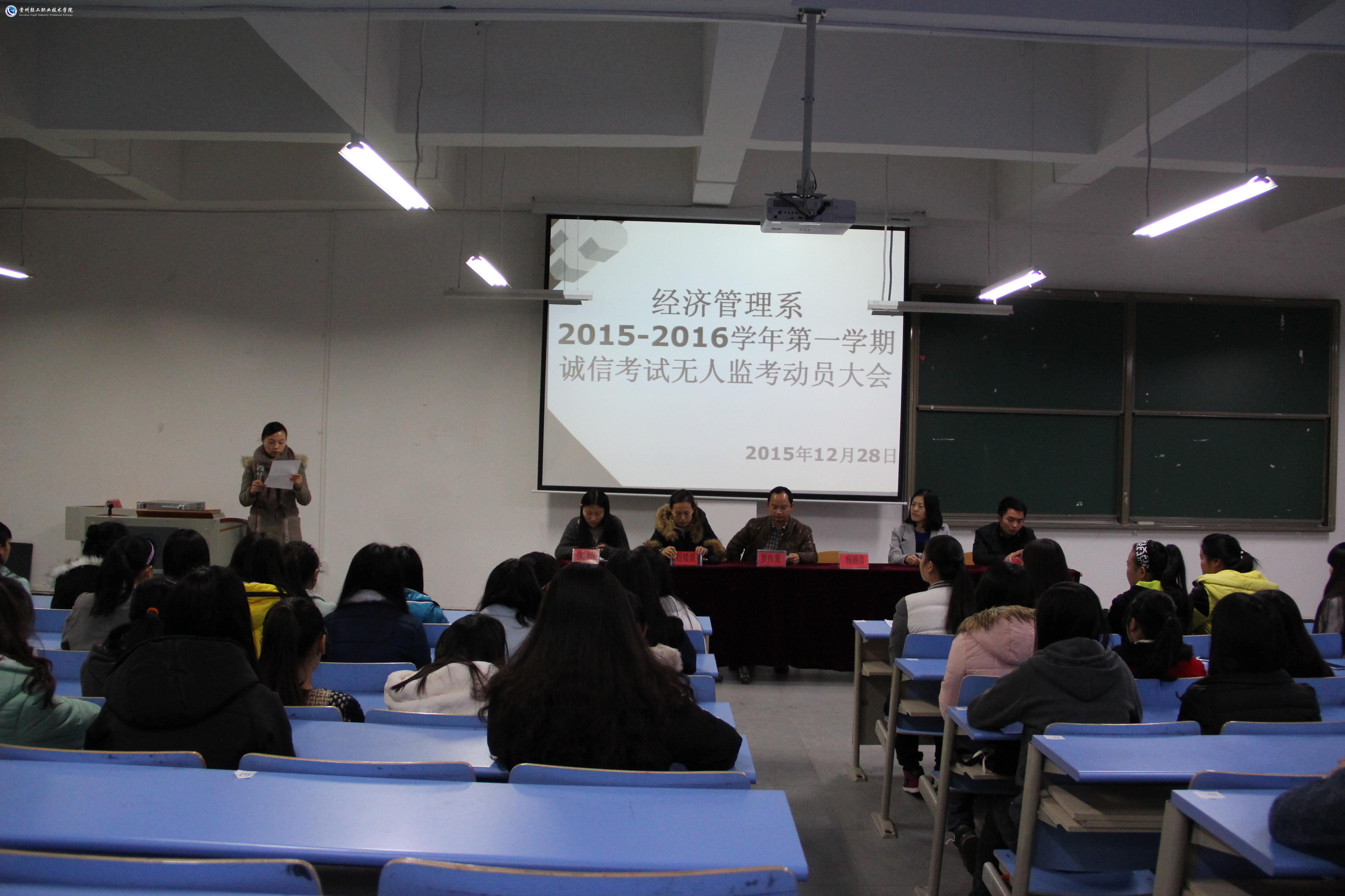 为树立学生诚信为本的道德观念,营造积极向上的考试氛围,进一步推进我系公平公正的考风考纪建设,12月28日下午4点半,经济管理系在3106教室举行“诚信考试,无人监考”动员大会,系党总支副书记罗传青、系学生管理科科长杨丽彦、系辅导员程媛媛、余庆、朱培、周红梅参加了本次会议。