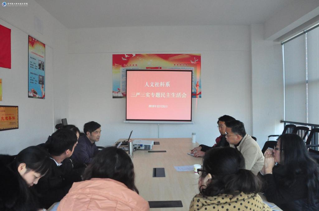 2015年12月31日上午,人文社科系“三严三实”专题民主生活会在系党员活动室召开,学院党委副书记杜平出席指导会议,系党总支书记王家友、党总支委员参加会议。系主任包节、副科级干部代表,教师党支部、学生党支部党员代表列席会议。会议由系党总支书记王家友主持。