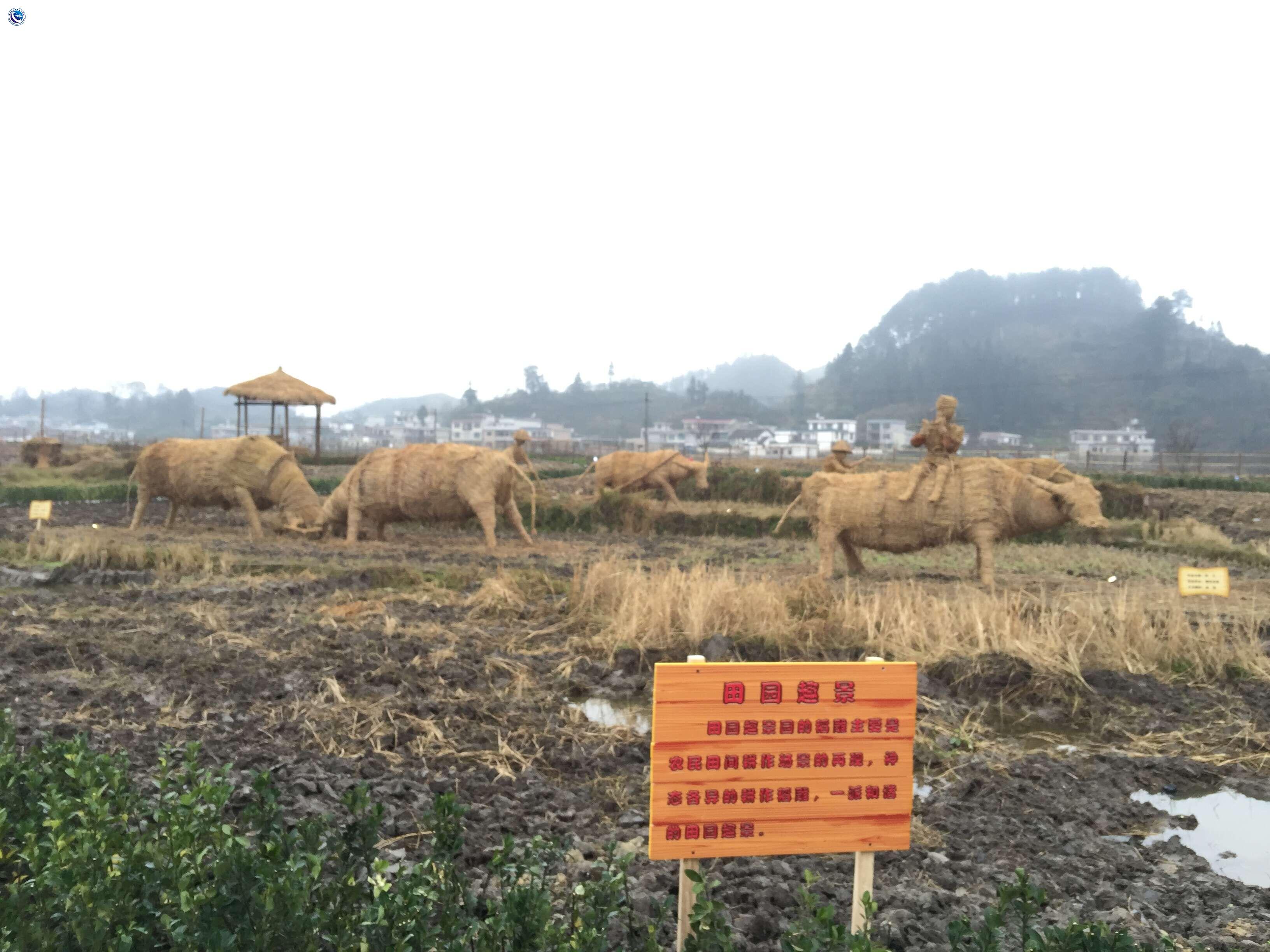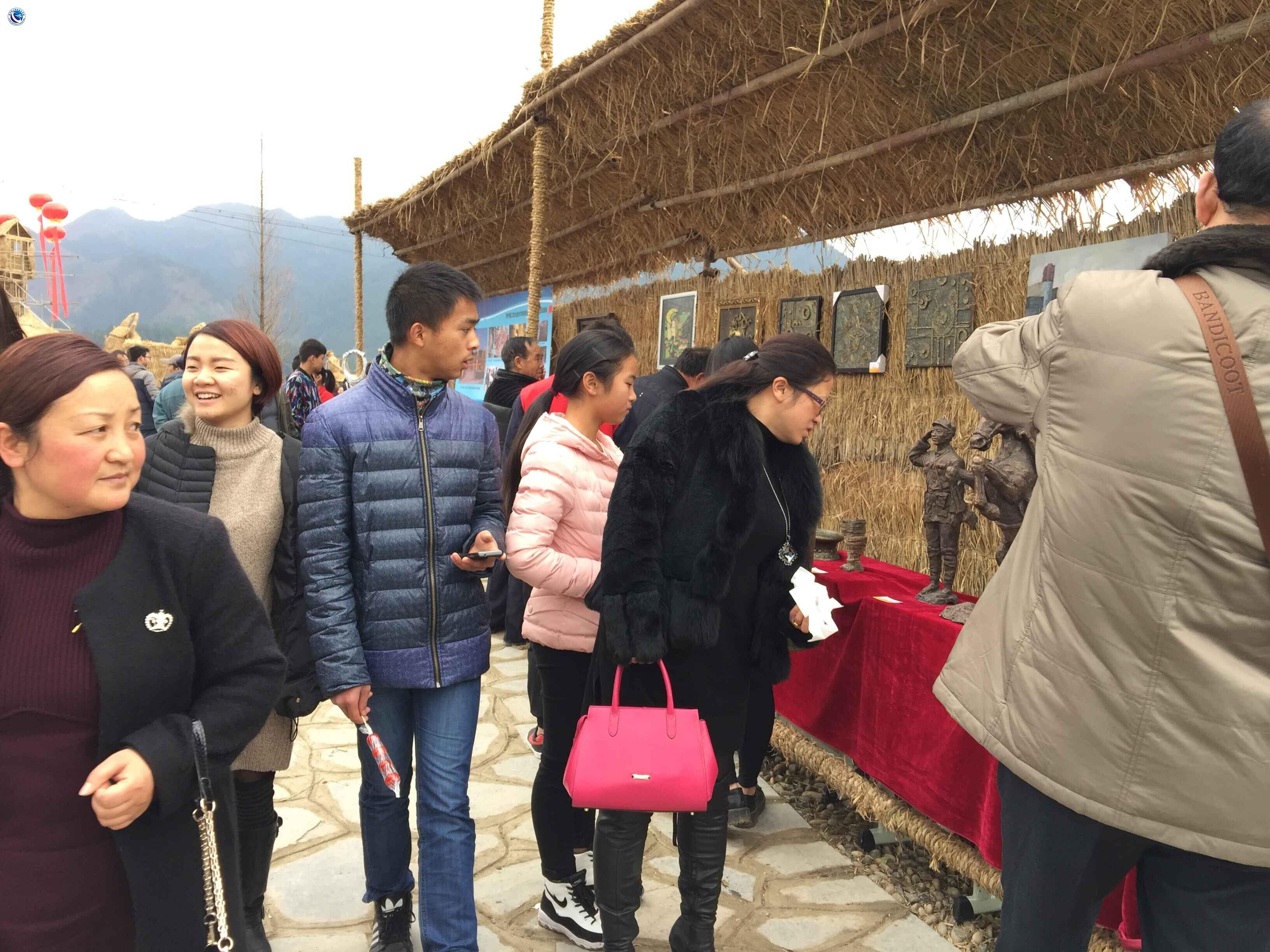 在稻草搭成的展架上,众多游客认真观赏,流连忘返。