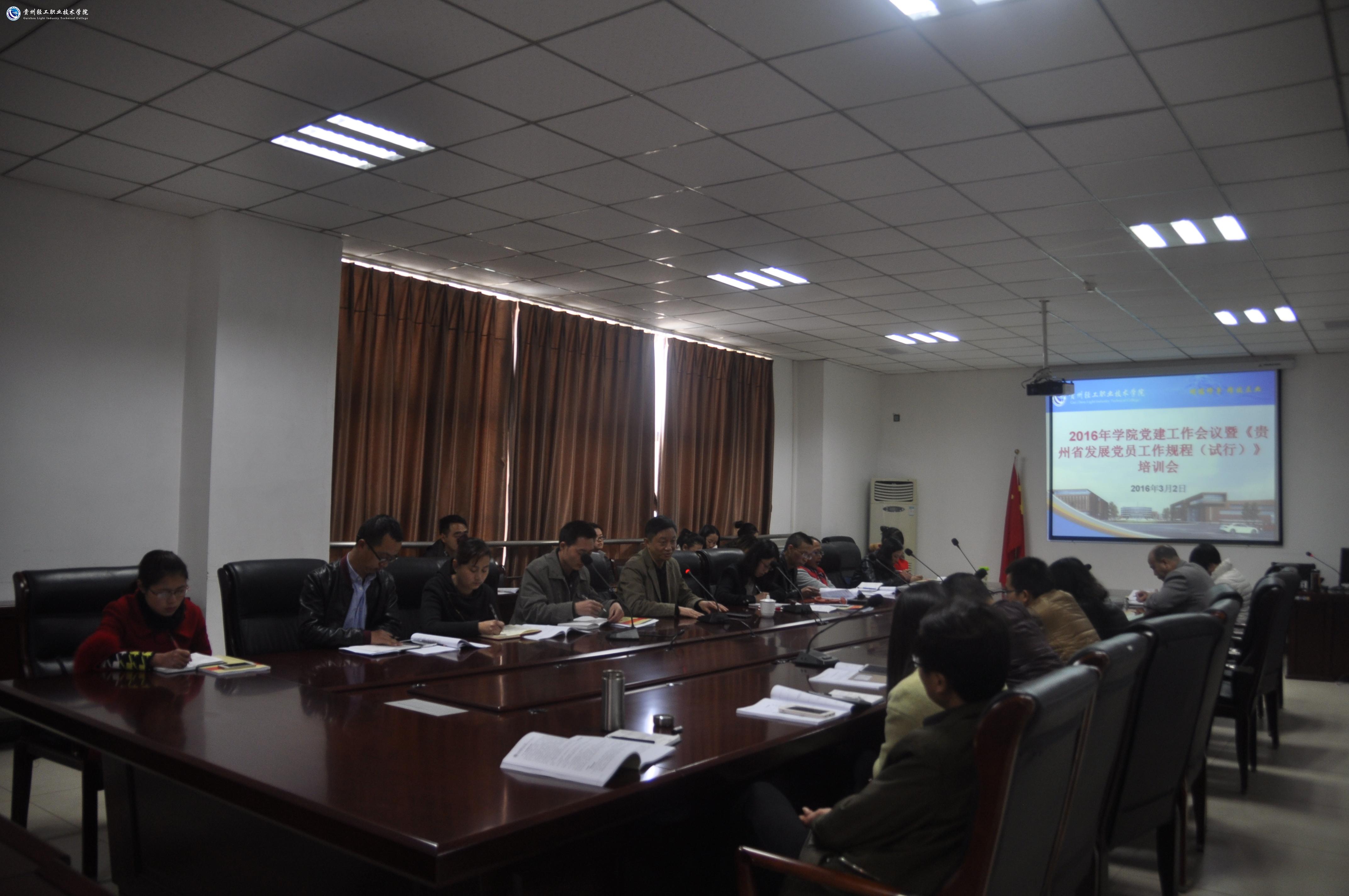3月2日上午,学院在行政楼第一会议室召开2016年新学期党建工作会议暨《贵州省发展党员工作规程(试行)》培训会议,党委副书记冯其毅出席会议,各党总支书记、副书记,各党支部书记、组织委员,组织部全体成员等参加会议。组织部负责人林茜主持会议。