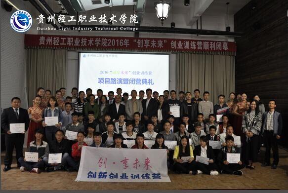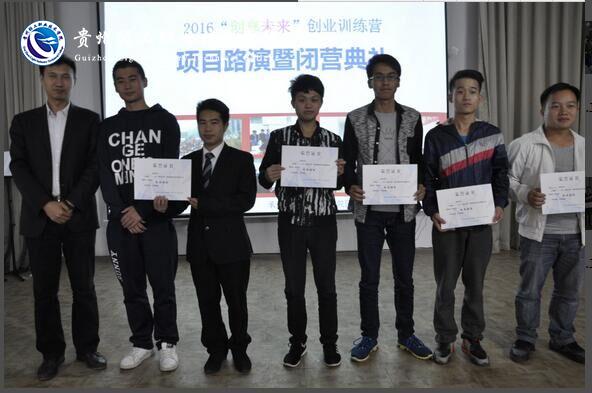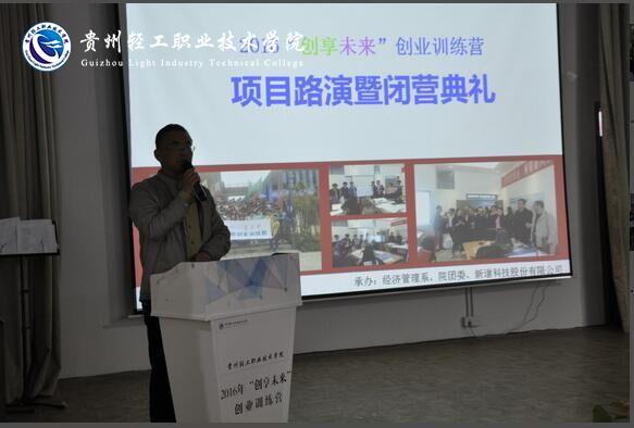 4月29日中午13:30,学院2016“创享未来”创业训练营项目路演暨闭营仪式在贵安创客总部联盟基地的报告厅内举行。学院党委副书记杜平、新道科技股份有限公司贵州分公司总经理孙胜儒先生、学院招生就业办主任SYB创业导师杨文通、学院科研处副处长徐楠、学生处处长兼团委书记暨星球、团委副书记许旺央、经济管理系教学管理科科长杨礼美担任评委,各系团总支书记、创业训练营全体学员及部分同学参加项目路演暨闭营仪式。项目路演由创业训练营班长韦宗斌主持。