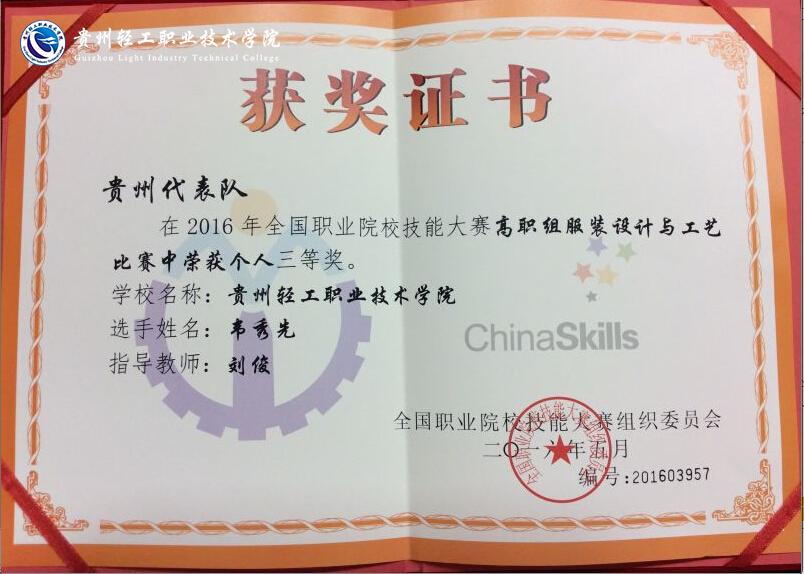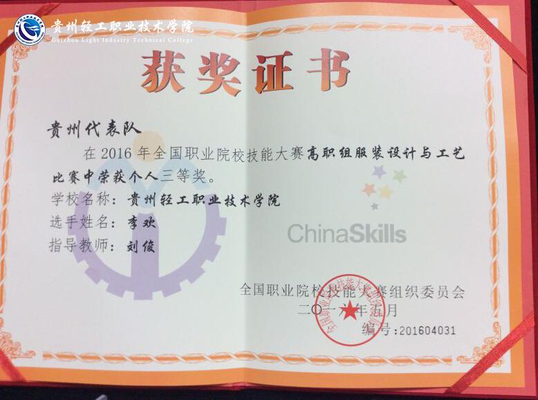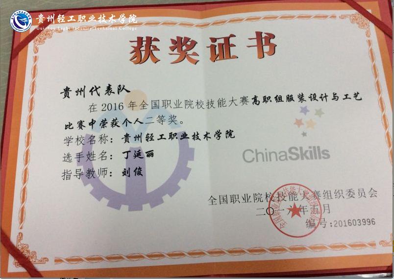 近日,2016年全国职业院校技能大赛服装设计与工艺大赛结果揭晓,学院代表队喜获佳绩。经过认真组织,精心准备,学院派出了艺术设计系服装设计专业学生组成代表队,代表贵州赴杭州职业技术学院参加服装设计与工艺大赛高职组的比赛,获全国二等奖1名,三等奖2名。