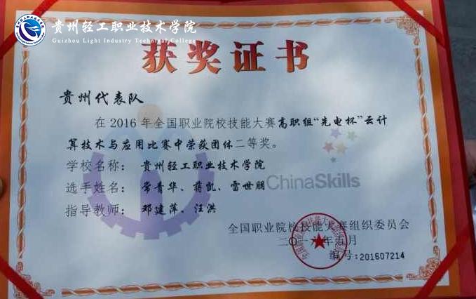 在2016年全国职业院校技能大赛中,学院积极组织,认真准备,代表贵州参加多个项目的比赛,继获得服装设计与工艺大赛和“科力达”杯测绘竞赛等多个国家级奖项之后,今又获得全国职业院校技能大赛高职组“先电杯”云计算技术与应用团体二等奖。
