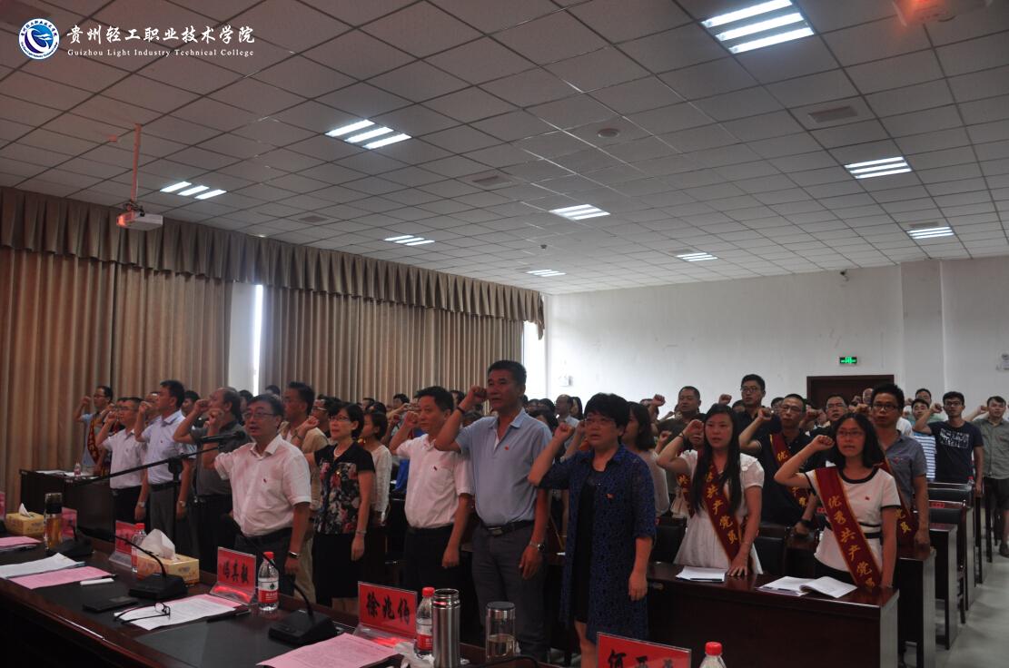 大会在雄壮的国歌声中拉开帷幕,院长周杰同志领誓,全体党员重温入党誓词;党委副书记杜平同志宣读了中共贵州省委党的建设工作领导小组《关于表彰2015年“全省同步小康驻村工作先进集体”“全省优秀村第一书记”“全省优秀同步小康驻村干部”的决定》(黔党建发〔2016〕1号),以及中共贵州轻工职业技术学院委员会《关于表彰先进基层党组织、优秀共产党员、优秀学生党员、优秀党务工作者的决定》。