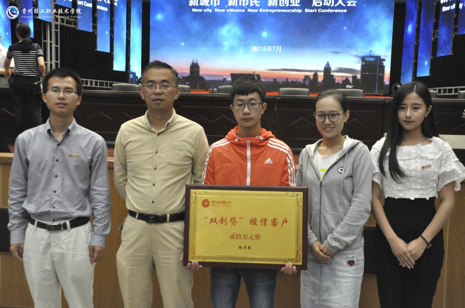 会上,贵州省副省长陈鸣明等领导为首批获得贵州银行“双创贷”贷款的9家双创企业授牌,8家企业现场上台接受贵安新区“双创扶持”政策兑现的现金牌。其中,我院大学生创业者郑传伟创办的“贵州易微笑文化发展有限公司”成为首批贵州银行“双创贷”授信客户,成功获得创业贷款。
