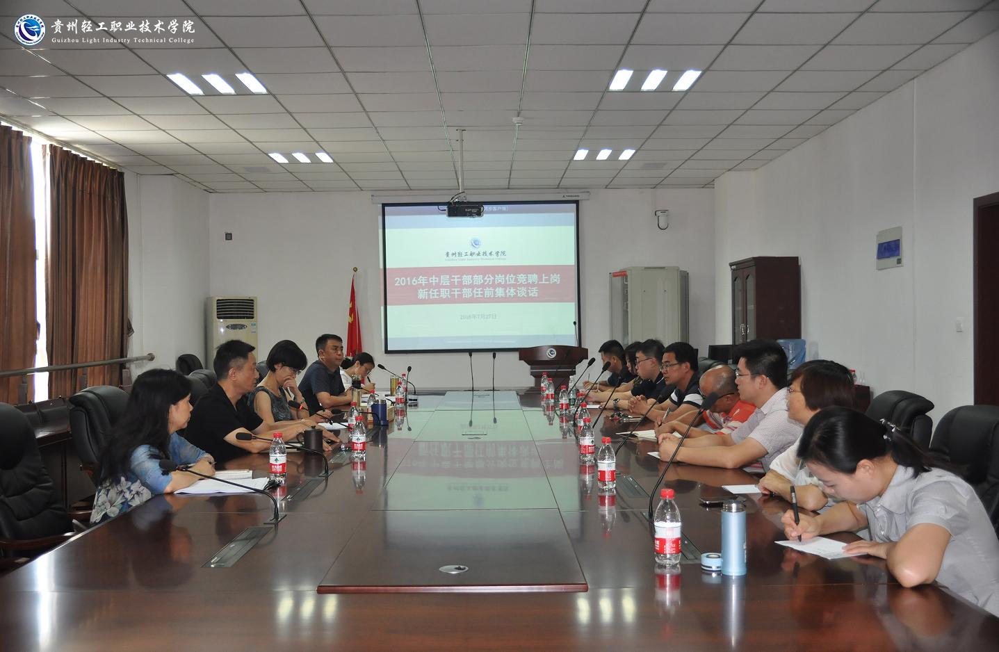 7月27日,学院召开2016年中层干部部分岗位竞聘上岗新任职干部任前谈话会议,对党委近期研究任命的新任职中层干部进行了任前集体谈话。学院党委书记卢亚莲、院长、党委副书记周杰、党委副书记冯其毅、党委委员、纪委书记董平等学院领导以及纪委、组织部相关同志、新任职中层干部参加会议。会议由党委副书记冯其毅主持。