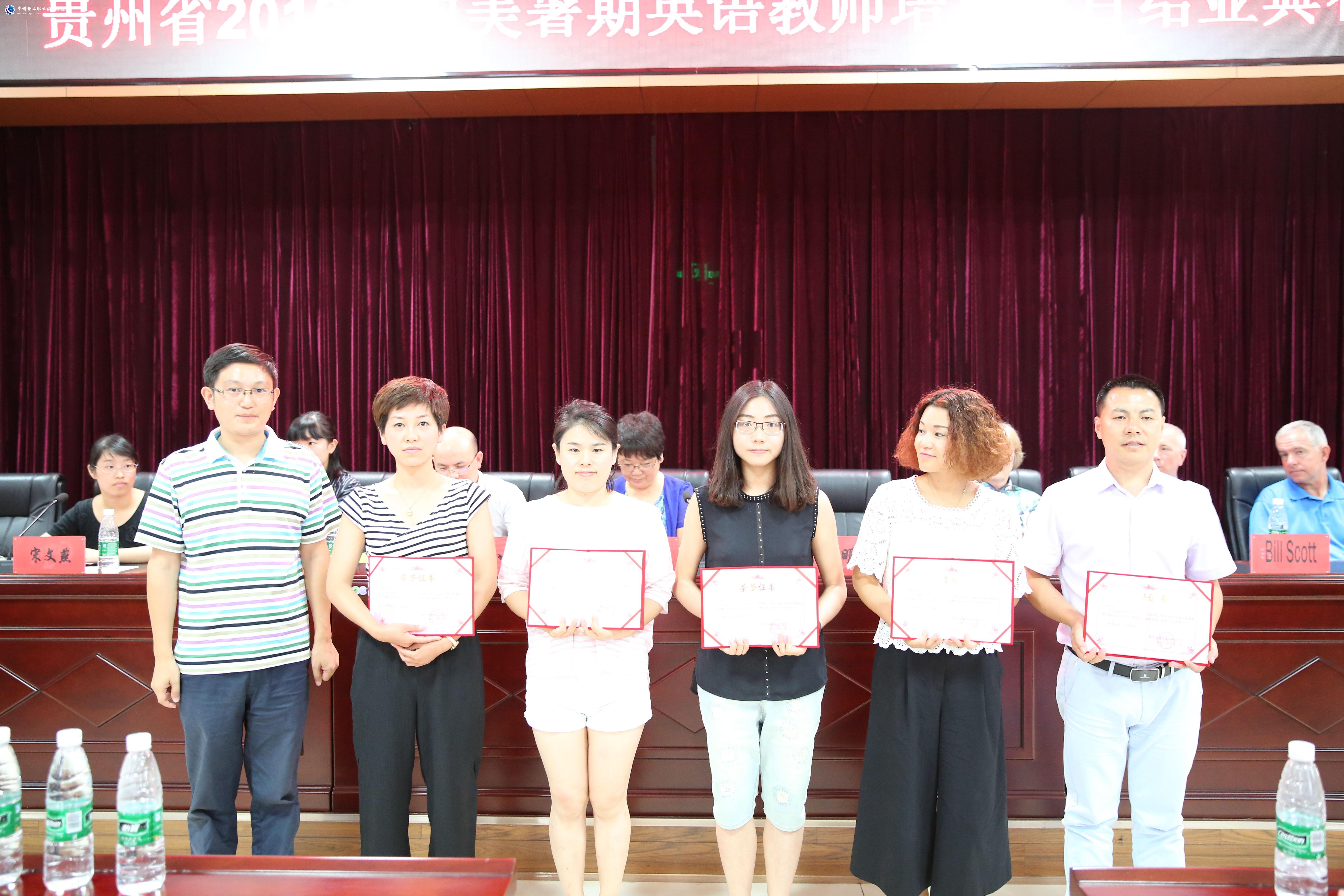 最后,陈秀娟副院长、任明勇、陈小飞、付薇分别为20名学员颁发了优秀学员证书; 美国英语学会外教团队为78名参训教师颁发了结业证书。