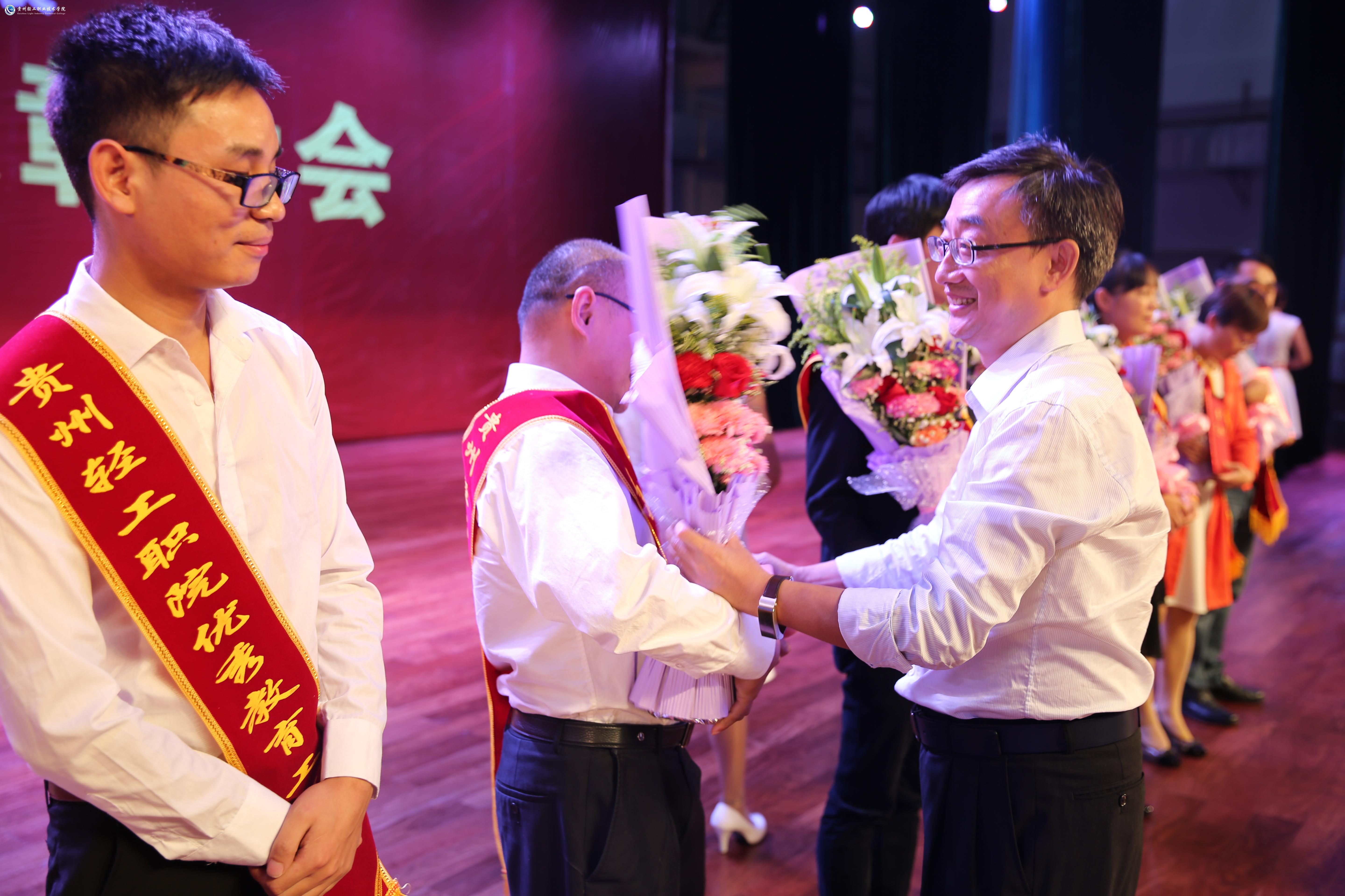 会上,党委委员孟永国同志为学院2016年度获得全国职业院校技能大赛二等奖、全国“职挑赛”二等奖的指导教师颁奖;副院长徐兆伯同志、副院长何亚平同志为获得学院2016年度职教名师颁奖,获奖的周晓妹老师接受了主持人的现场采访,互动环节掀起表彰活动的第一轮高潮;学院党委副书记杜平同志为学院2016年度优秀教学团队颁奖;辅导员团队带来的节目《因为我是辅导员》赢得了台下师生的阵阵热烈的掌声;学生代表们为获得学院2016年度“我最喜爱的辅导员”和“我最喜爱的老师”荣誉称号的老师奖颁奖;院长周杰同志为获得学院2016年度“优秀教育工作者”荣誉称号的老师颁奖;学院党委书记卢亚莲同志为获得学院2016年度“优秀教师”荣誉称号的老师颁奖,获奖老师胥可家老师老师接受了主持人的现场采访,胥可家老师现场表达了当好一名好老师心得和感受,引起了台上台下全体师生的强烈共鸣;朗诵《致三十年前的自己》再次掀起活动新高潮;最后,教育厅党组副书记、副厅长王碧海同志为荣获2016年“三十年教龄”荣誉称号的老师颁奖。