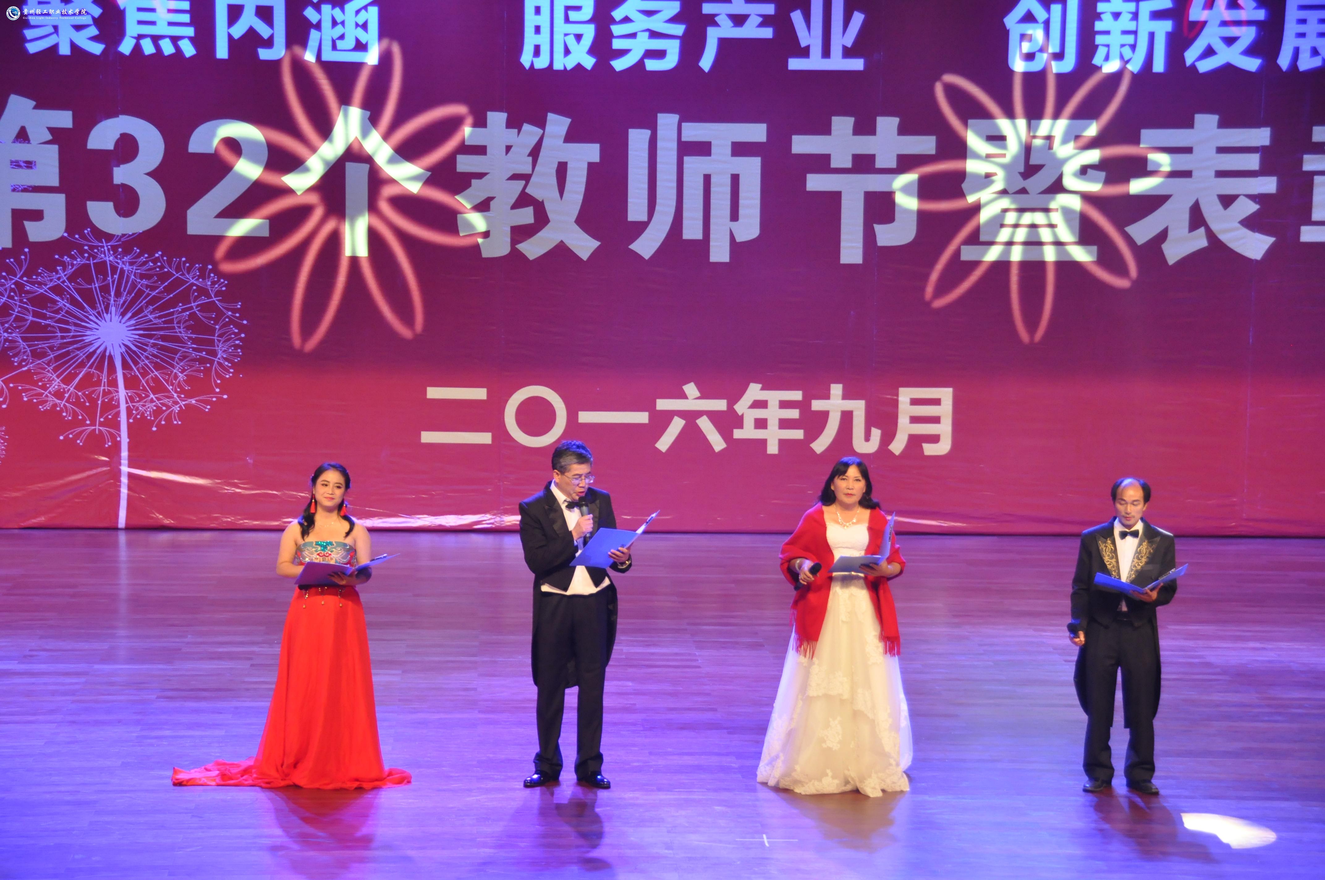诗朗诵《仰望星空》,透露的对真理、正义、自由、博爱的思考,对国家民族人类共同命运的关怀,令全场师生动容,深省。学生代表把饱含祝福和敬意的康乃馨送到了老师身边,舞台两侧的大屏幕上播放了没到现场的学生通过视频的方式向老师表达节日的祝福;最后,学院2016年庆祝第三十二个教师节暨表彰大会在合唱《我和我的祖国》的浓浓氛围中落下帷幕。