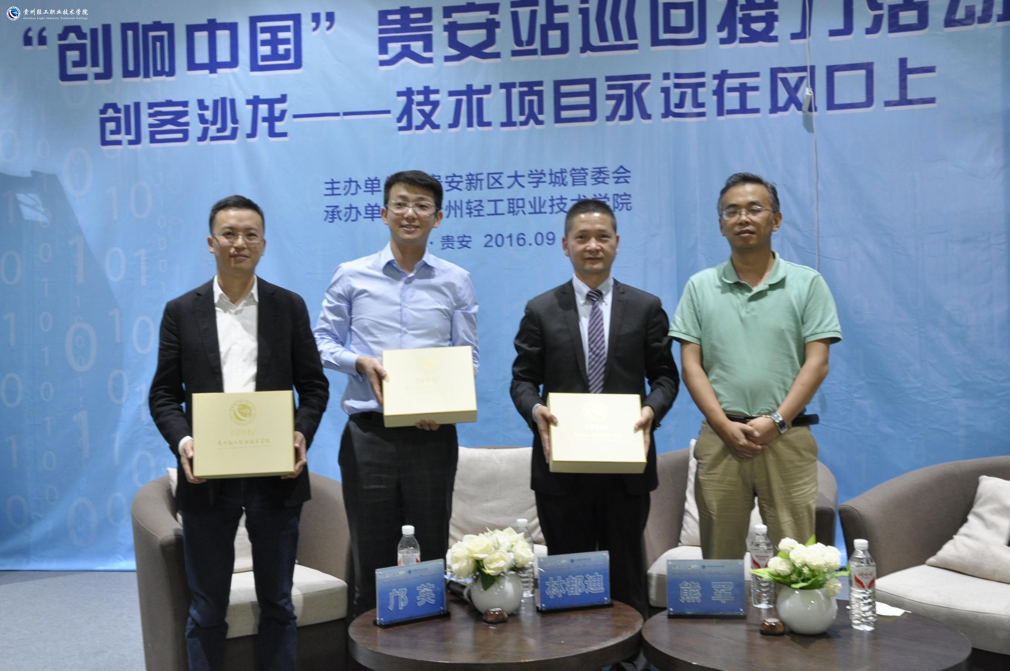 9月20日下午15:30,“创响中国”贵安站巡回接力活动之创客沙龙-技术项目永远在风口上在我院中国贵安创客联盟总部基地举行。学院党委副书记杜平、学生处处长兼团委书记暨星球、团委副书记许旺央出席活动,活动还邀请到36氪联合创始人(北京协力筑成金融信息服务股份有限公司)林都迪董事,我院杰出校友贵州一品传媒有限公司熊军董事长、贵州茅台酒厂文化旅游有限责任公司副总经理、贵州久远物业有限公司董事长邝英莅临活动现场,本次创客沙龙由程媛媛老师主持,各系学生创业团队代表100余人参与此次活动。