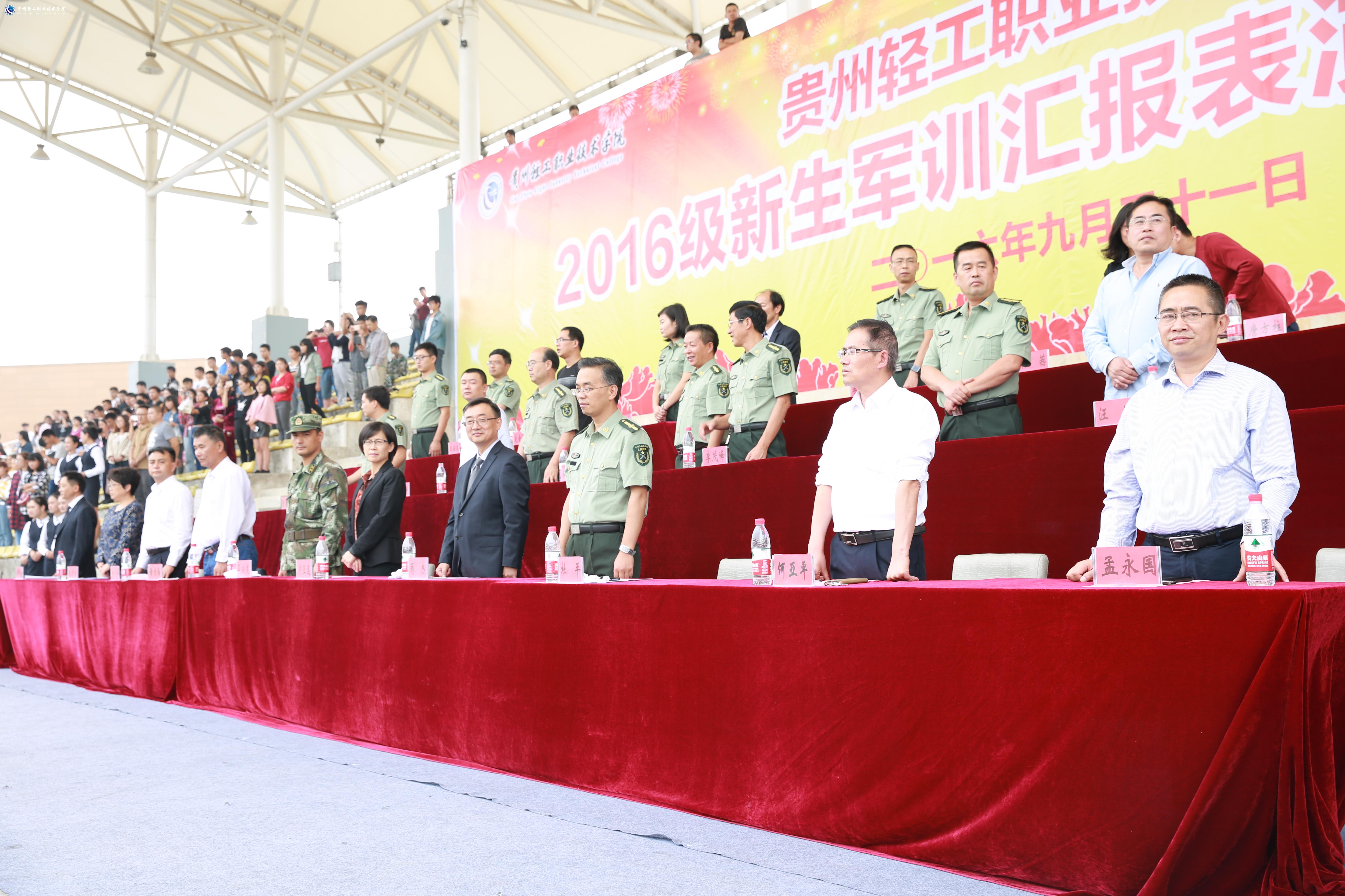 9月21日下午,学院在足球场召开2016级新生军训汇报表演暨总结表彰大会。学院党委书记卢亚莲、院长周杰等学院院领导,贵州省武警总队军乐团政委吴运发,相关部门主要负责人,军训团教官及2016级全体新生参加。大会由学院党委副书记冯其毅主持。
