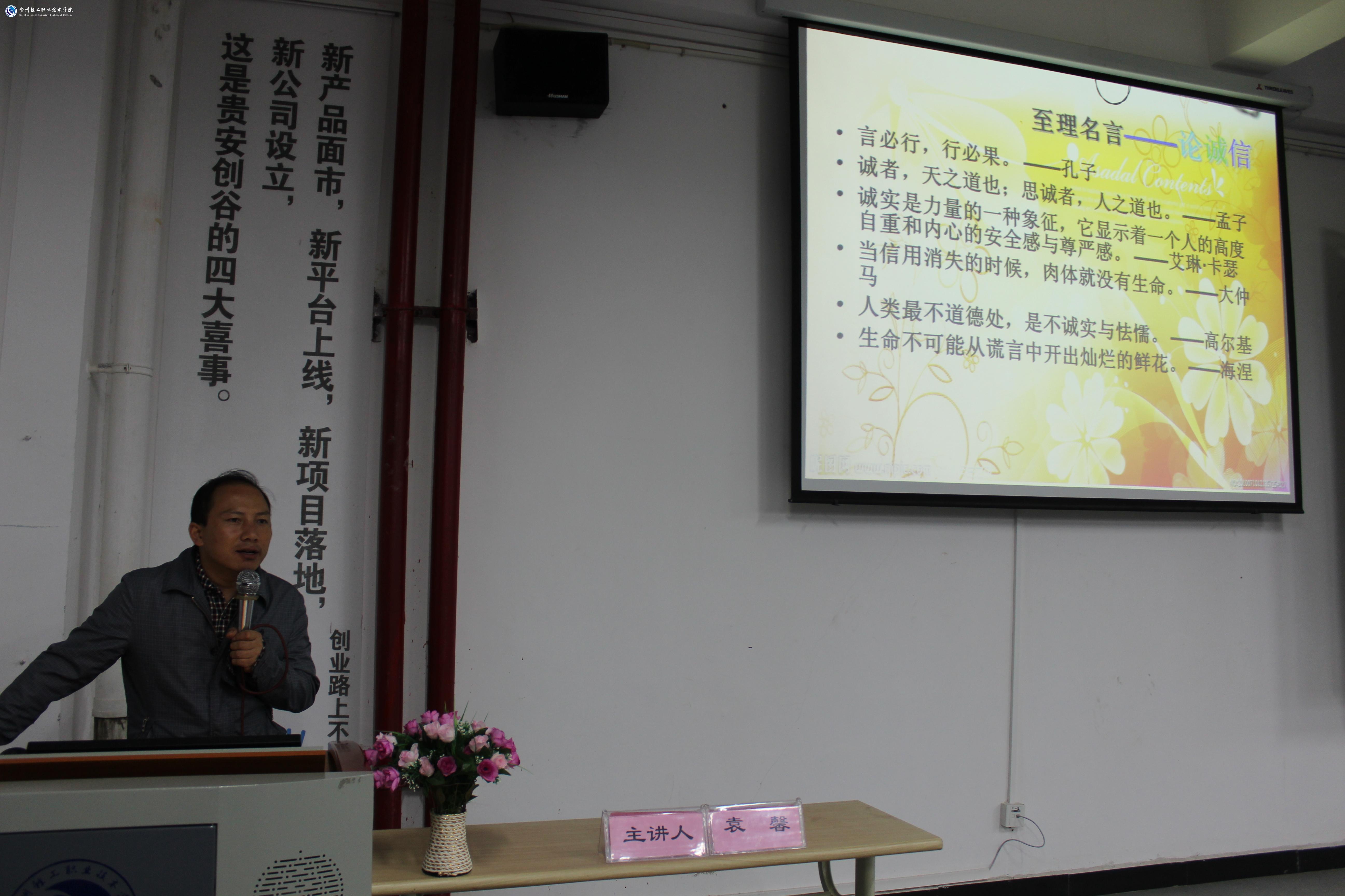 袁馨部长此次道德讲堂以《立身之本 诚信为先》为题,提出“日常生活中,你是否做到‘言必行、行必果,有诺必践’?你对承诺的信守,是否会因为对方社会身份的高低而不同?当你的朋友不守信约时,你会怎么做?”三个问题正式开始了此次道德讲堂活动。他指出,诚信是一切道德的基础和根本。抱诚守信,为人做事以诚信为本,这是五千年中华传统文化沉淀下来的道德精华,也早已成为我国人民的立身处世之根本。在谈到个人诚信的建设时,袁部长提出同学们要做到心理诚信、交往诚信、行为诚信。讲座最后,袁部长希望同学们遵守诺言就象保卫自己的荣誉一样,诚信如甘露,社会若大地,甘露缺失,大地将出现裂痕;诚信如水,道德若船,诚信人越多,社会公德水平就会越高。要牢记此次道德讲堂活动的主题:立身之本,诚信为先,事事规范自己的言行,人人争做有道德的人。