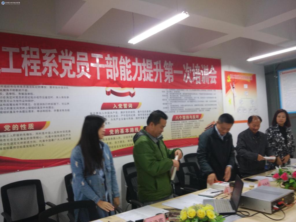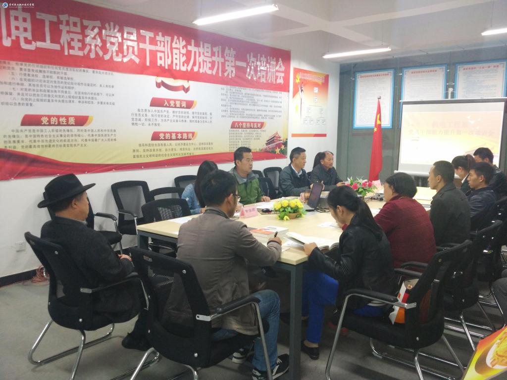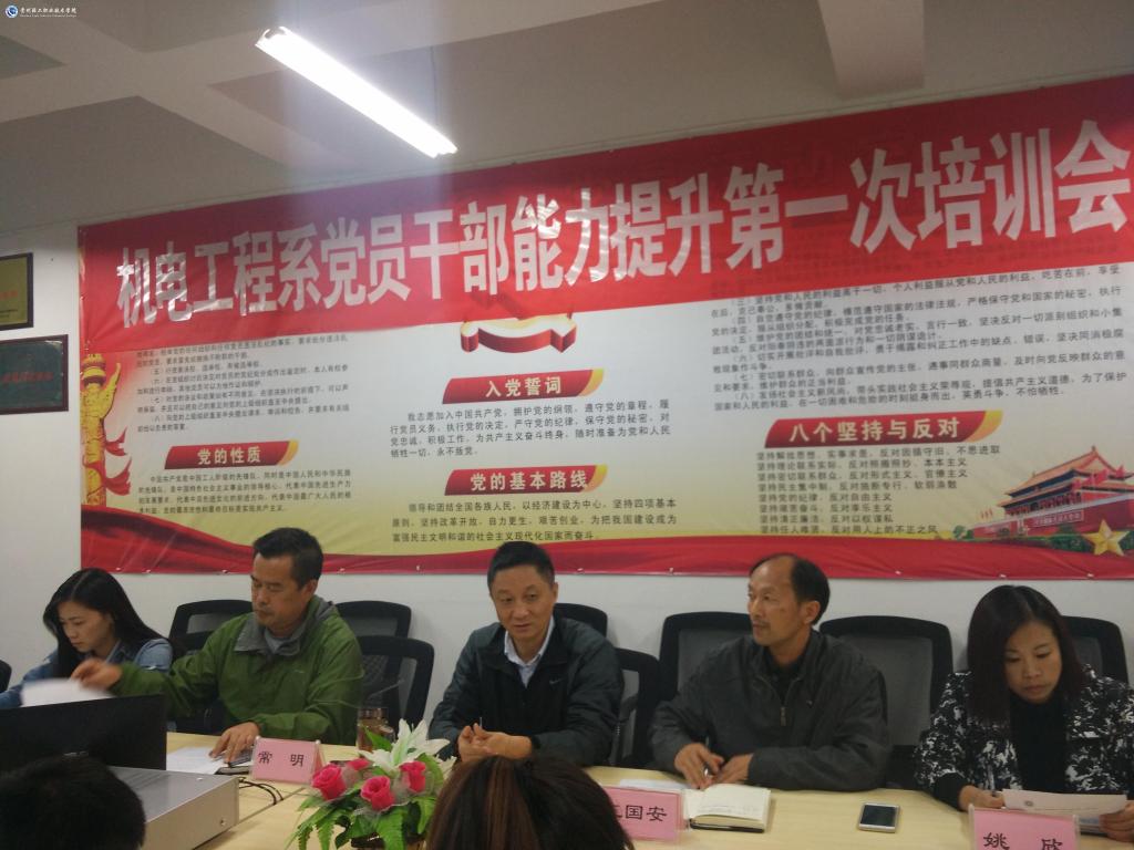 为不断提高系部党员干部能力,10月11日下午,机电工程系在系部会议室举行党员干部能力提升第一次培训会。出席会议的有学院党委副书记冯其毅、系主任王国安、系党总支书记常明、系副主任姚昕、系党总支副书记黄海燕及全体党员干部。