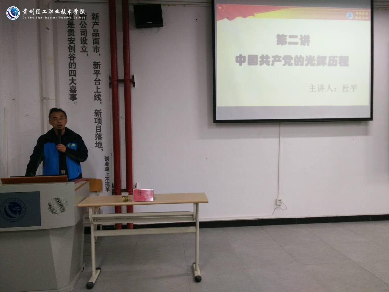 11月15日晚上19:00,由轻工化工系承办,经济管理系、信息工程系、艺术设计系、建筑工程系、机电工程系、人文社科系协办的第二十二期“党的知识”培训班邀请学院党委副书记杜平,主讲党课《中国共产党的光辉历程》。