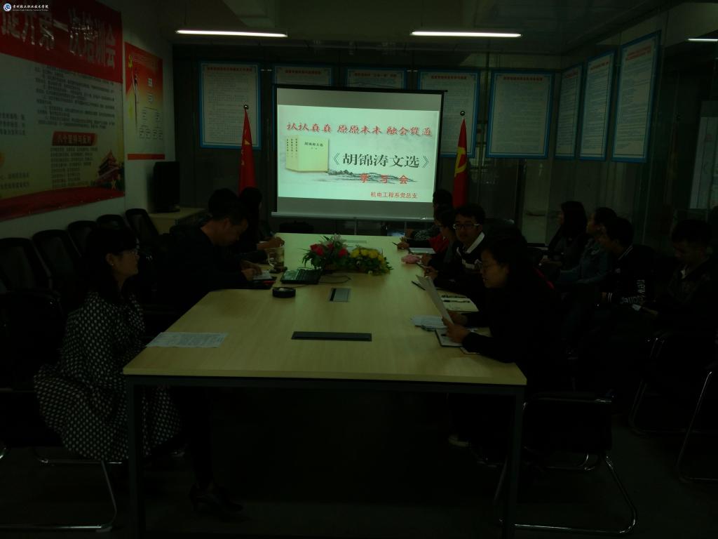 2016年11月21日上午10点,机电工程系党总支在系部会议室组织学习《胡锦涛文选》,系部全体党员干部、教职工参会。