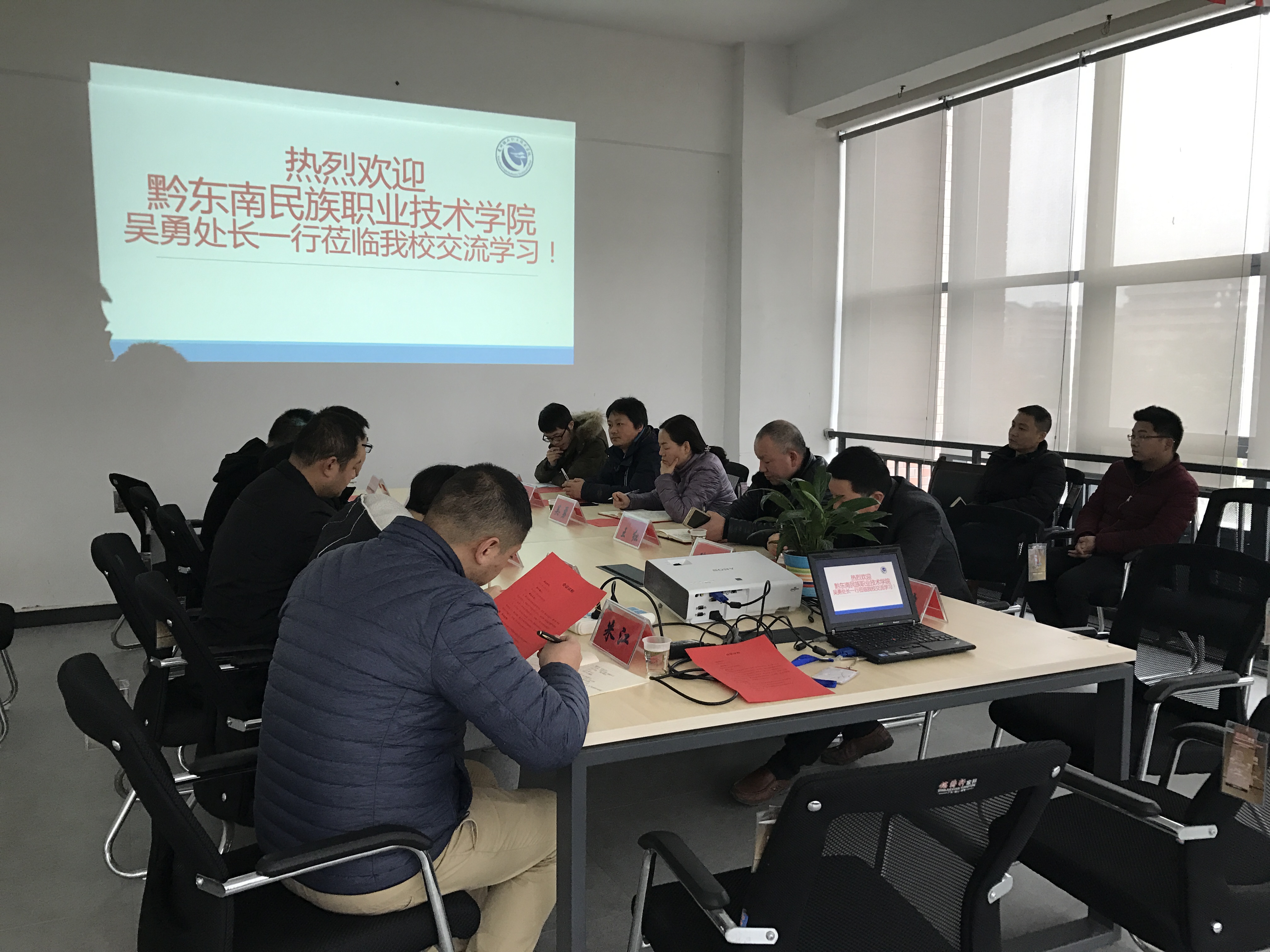 3月21日上午,黔东南民族职业技术学院教务处处长吴勇一行7人莅临我处进行交流学习。我院教务处副处长王珂佳、教务处副处长孙辉热情接待了吴勇处长一行。