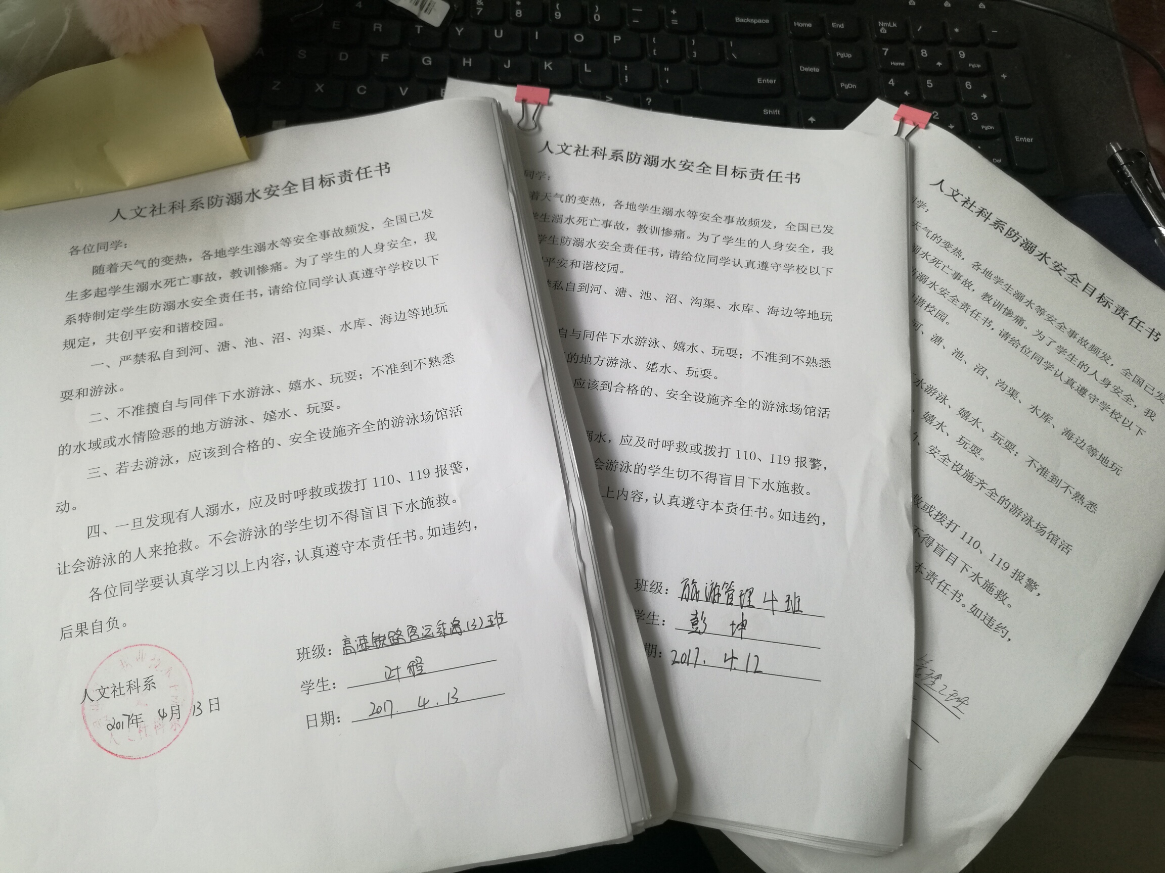 活动开展以来,人文社科系500余名在校学生与系部签订了“人文社科系防溺水责任书”,班主任、辅导员走访宿舍70余间,发放安全知识宣传页1000余份。在校学生都表示,通过安全教育周让自己进一步了解了如何防范安全事故的发生,也懂得了安全重于泰山、安全人人有责。