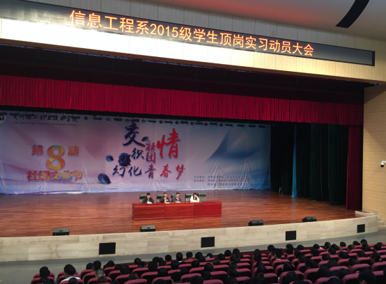 5月23日上午,信息工程系2015级学生顶岗实习动员大会在学生事务中心大礼堂隆重召开,此次动员大会受到信息工程系领导的高度重视,系主任汪洪、系党总支书记张庚斐等亲临现场并讲话,2015级全体学生、班主任和实习指导老师参与了此次大会。