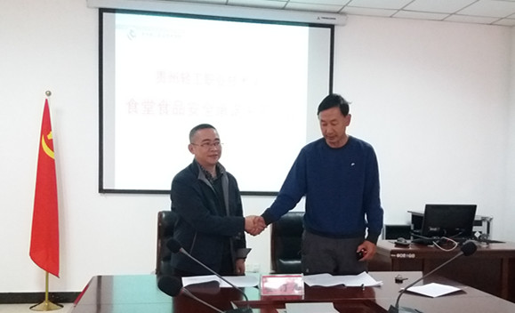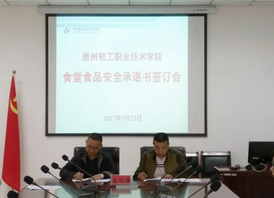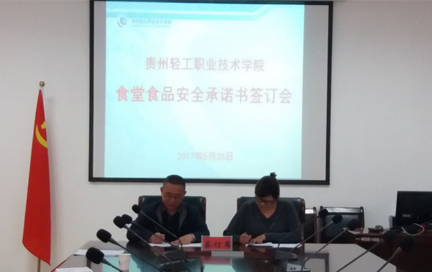 为保障师生的饮食安全,规范学院食堂管理,5月25日上午9:00,总务处召开2017年食堂食品安全承诺书签订会,学院党委委员孟永国与学院内3家托管食堂的负责人签订了《贵州轻工职业技术学院食堂食品安全承诺书》。