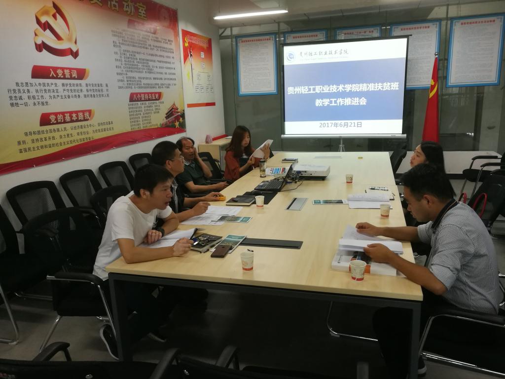为贯彻落实省委、省政府关于扶贫攻坚的安排部署,办好我院教育精准扶贫“威宁班”和“赫章班”,6月21日,贵州轻工职业技术学院精准扶贫班教学工作推进会在机电工程系召开。会议由中职部主任杨力伦老师主持。机电工程系主任王国安、副主任姚昕、叶世群副教授、建筑工程系主任唐芳柱、李世海老师参加会议。