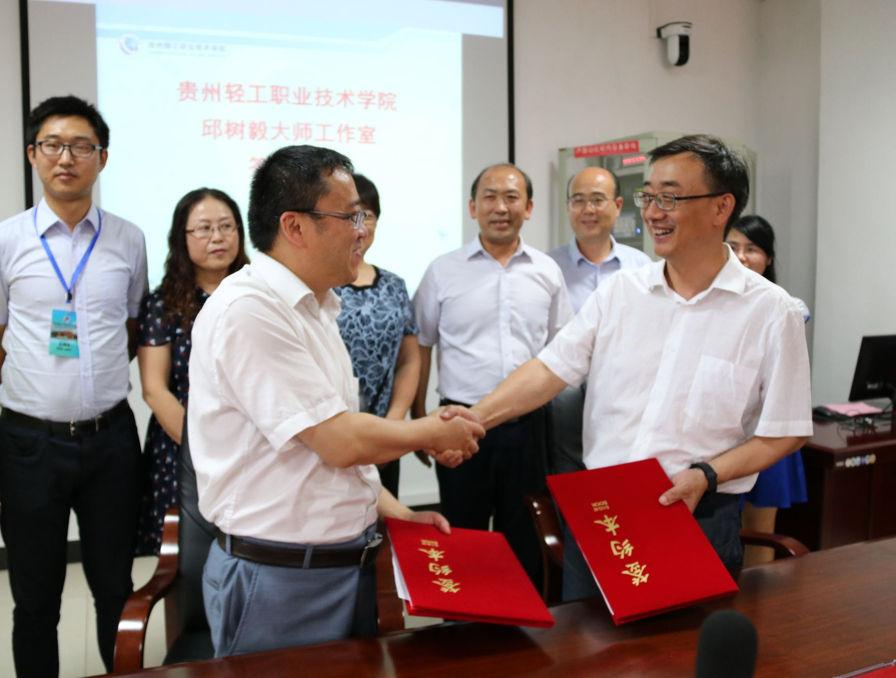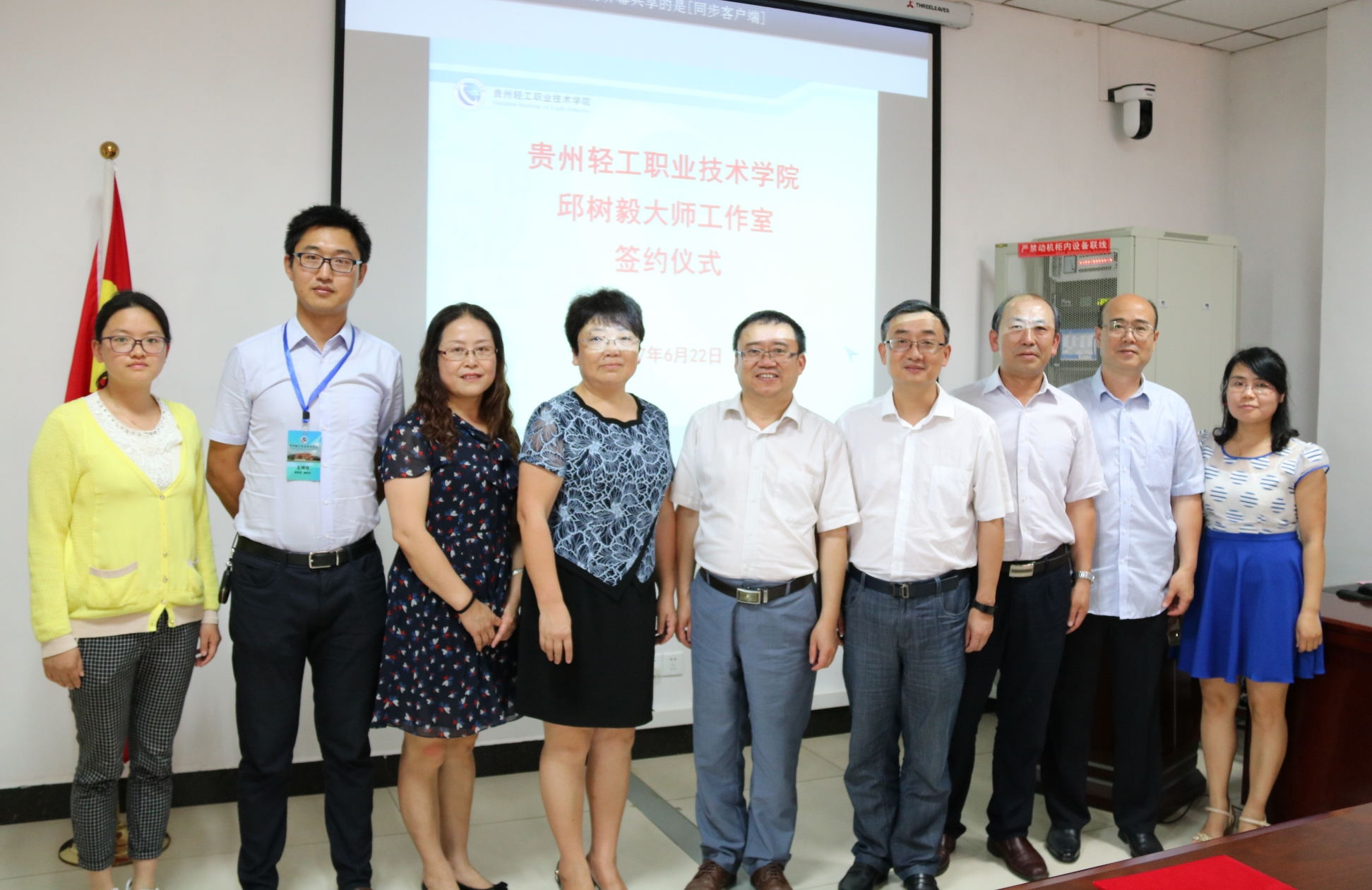 贵州轻工职业技术学院邱树毅大师工作室签约仪式于2017年6月22日在行政楼第一会议室隆重举行。学院代表院长周杰、副院长刘天德、副院长陈秀娟、轻工化工系总支书记余寒和邱树毅大师及大师工作室校内团队成员王娟、王珂佳、黄洪媛、任艳玲参加此次签约仪式,会议由副院长刘天德主持。