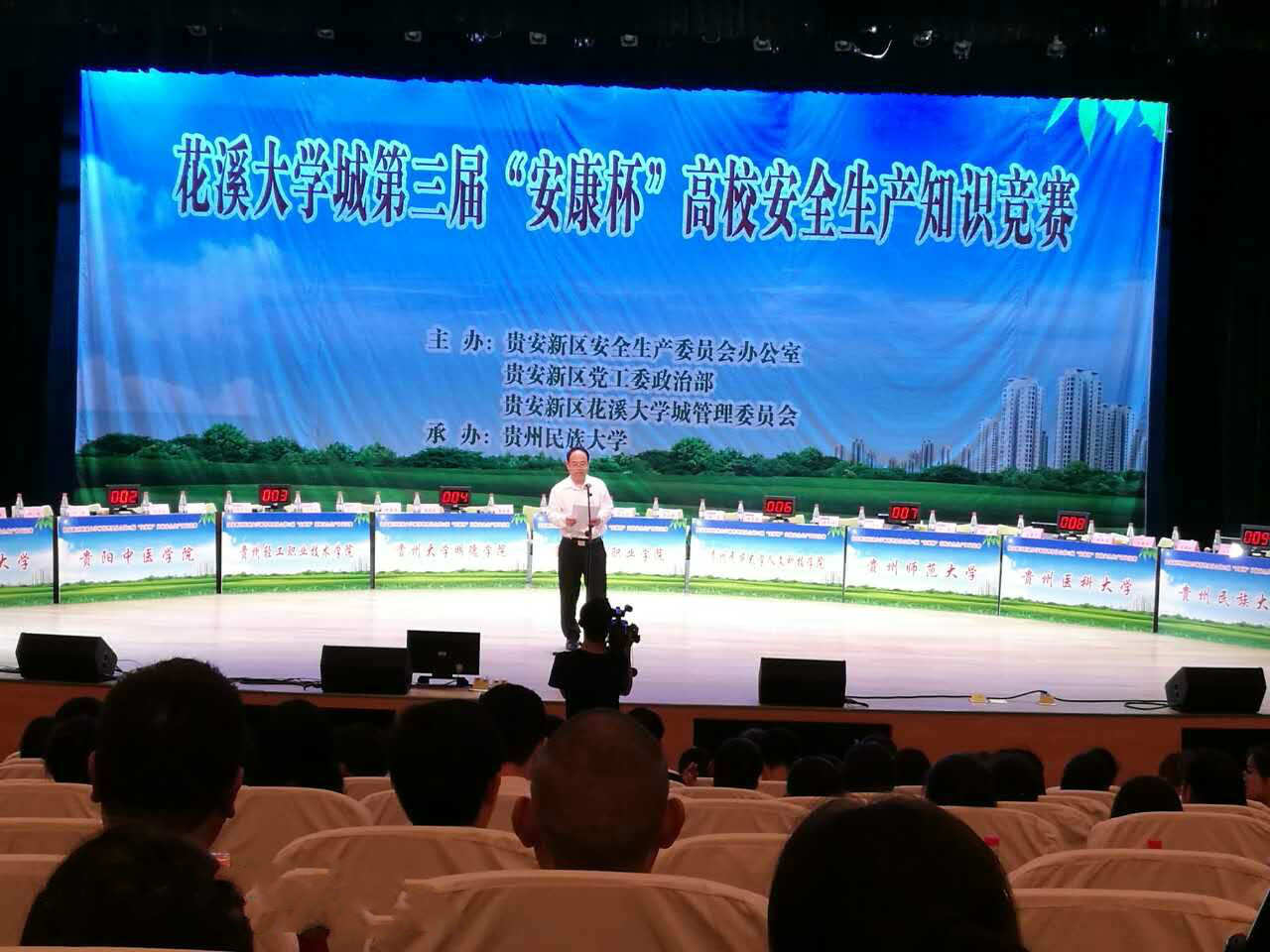 6月23日下午14:00,花溪大学城第三届“安康杯”高校安全生产知识竞赛在贵州民族大学大学城校区举行。学院保卫处组织三位同学组成参赛队参加比赛,保卫处副处长张志、消防科科长阮长河带队。