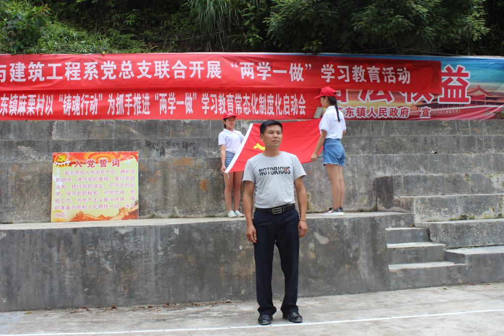 面对鲜艳的党旗,在建筑工程系党总支学生党支部彭旺同志的领誓下,建筑工程系党员同志、预备党员同志,以及麻栗村的党员同志们,举行了严肃的宣誓,重温入党时那激动人心的一刻,使全体党员接受了一次深刻地革命洗礼。