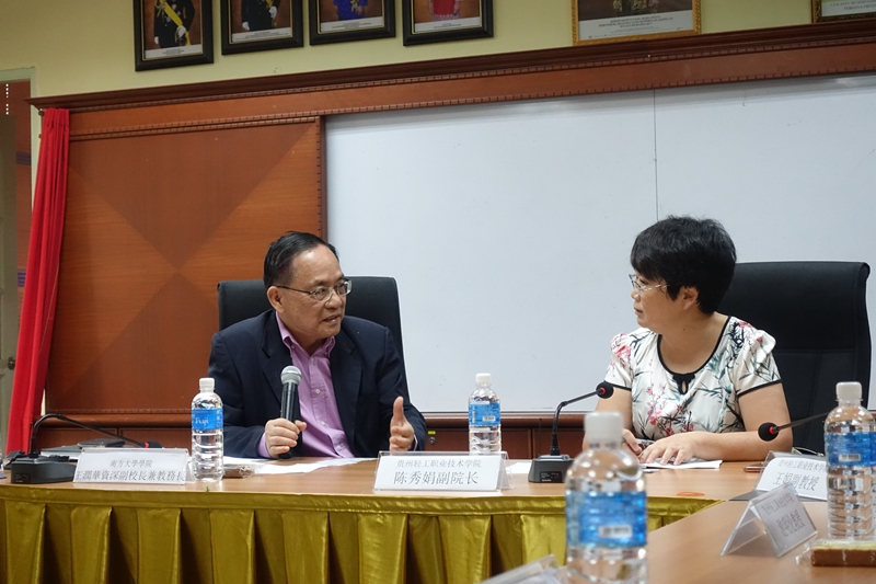 副院长陈秀娟、轻工化工系主任王娟、教务处中外合作办学工作人员陈谨与南方大学学院教育与工艺学院副院长梁桂花助理教授、国际留学生处总监陈锦松先生以及南方技职中心副主任麦一德先生就双方合作举办烹调工艺与营养专业共建以及教师学历提升合作等事宜进行了商讨