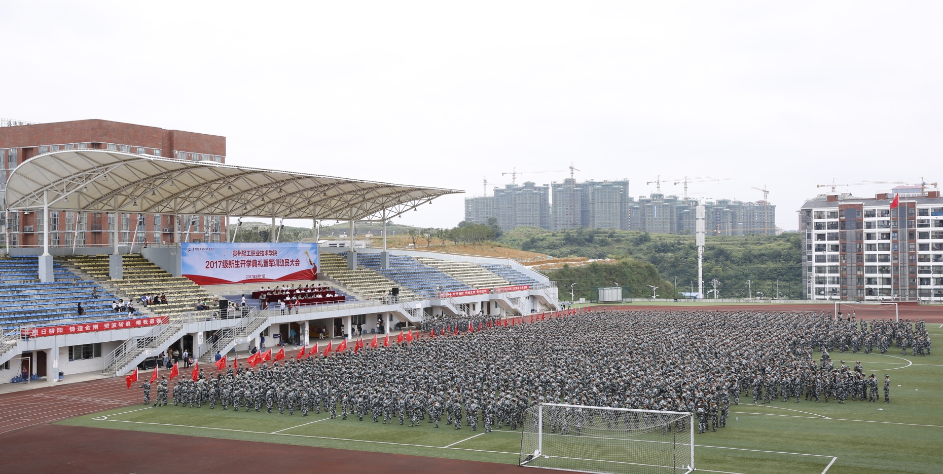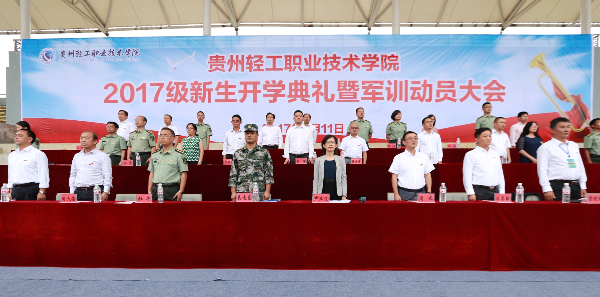 9月11日上午,学院在足球场举行2017级新生开学典礼暨军训动员大会。学院党委书记卢亚莲,院长周杰等学院领导,贵州省武警总队军乐团政委吴运发,相关系部主要负责人,军训团教官,专兼职辅导员及2017级近4000名新生参加。大会由学院副院长陈秀娟主持。