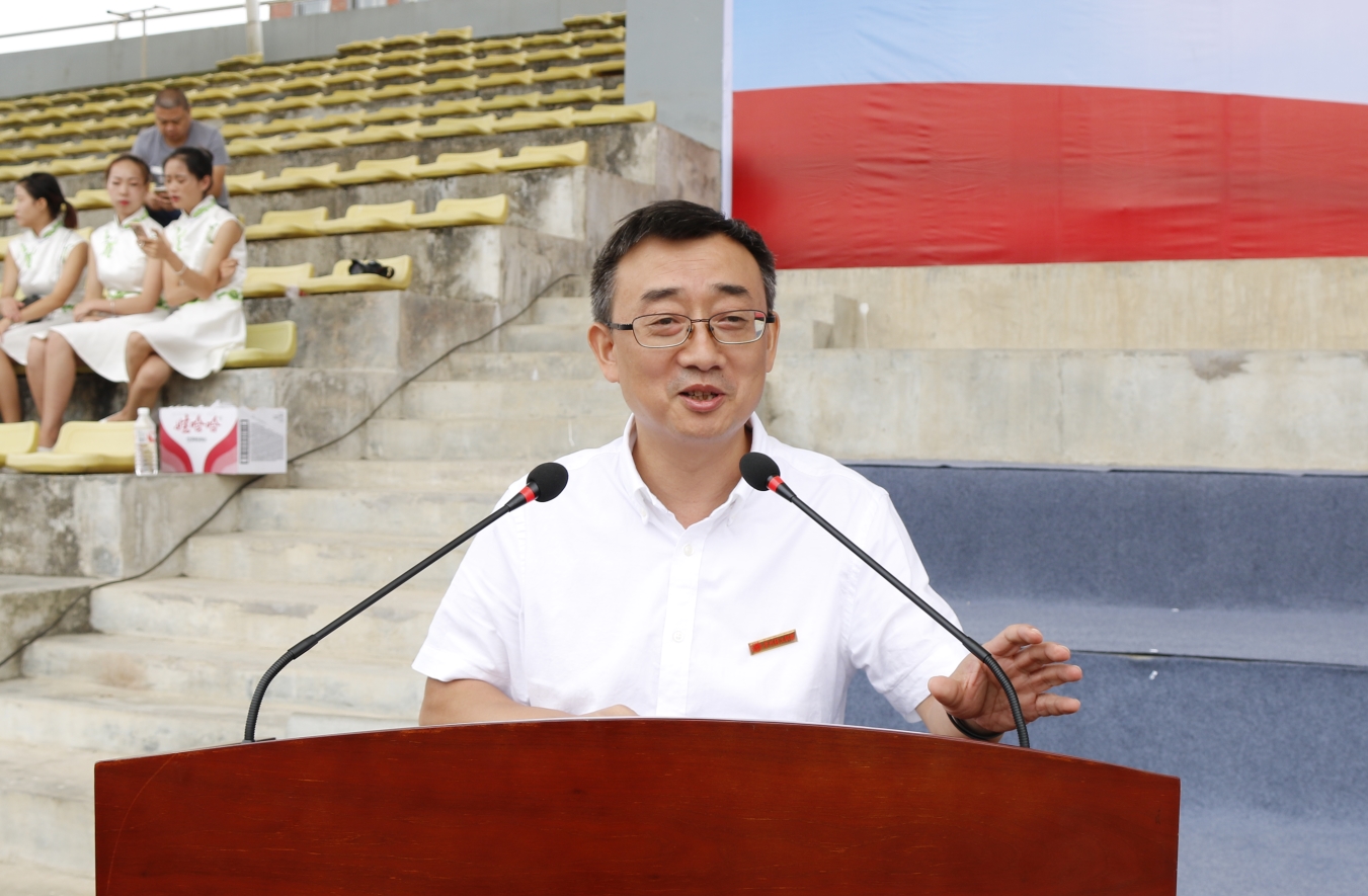 院长周杰讲话,他首先代表学院党委、行政及全体教职员工对全体新同学、武警贵州总队军乐团首长及教官表示热烈的欢迎。他简要介绍了学院概况、发展历程及近年来所取得的成绩,并提出四点希望:一是希望新生们学会做人,学校培养的人不应该是成为用一生去追求幸福的人,而是要成为幸福的去追求一生的人;二是希望新生们学会学习,具备长远眼光;三是希望新生们树立“工匠精神”,那就是要锤炼过硬的职业技能,培养认真严谨的职业态度,追求精益求精的专业精神;四是希望新生们勇于奋斗,抓住机遇,用自己的技能和品格来证明自己,成为这个社会最需要的技术技能人才。