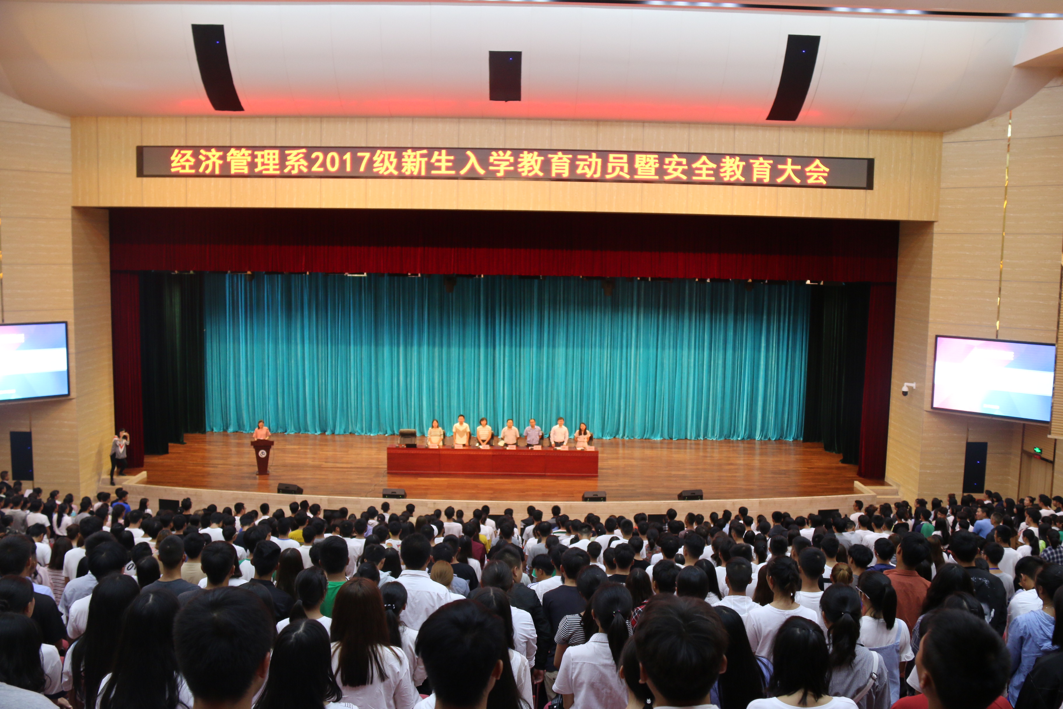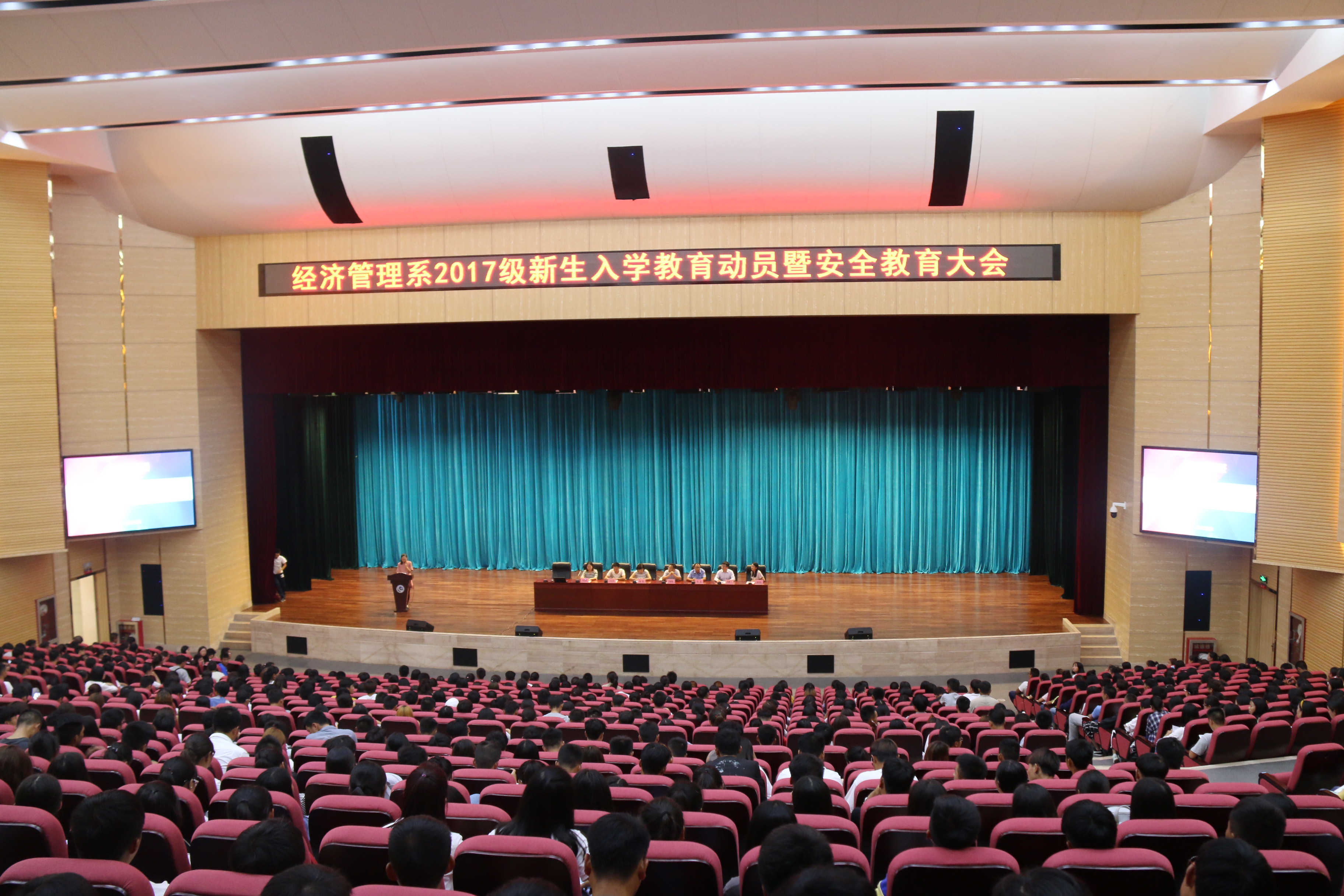 为帮助2017级新生尽快更好地适应大学生活,9月26日17:30,经济管理系在学生事务中心礼堂举行2017级新生入学教育动员暨安全教育大会。经济管理系系主任李德建、系党总支书记杨阳、保卫处副处长张志、系副主任吕志君、系党总支副书记梁鹏飞、教学管理科研科科长杨礼美、团总支书记黄章琼、全体坐班教师以及2017级全体新生等800多人参加大会。大会由程媛媛主持。