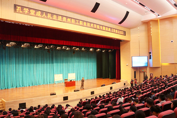 2017年11月7日上午10:25分,孔学堂成人礼走进贵州轻工职业技术学院专题讲座《学贵立志》在学院大礼堂开讲,主讲人:钟中,国家二级编导,贵州省文明办聘请的孔学堂十大德师之一,贵州省谦德传统文化公益传播中心理事长,贵阳孔学堂——谦德传统文化传习院院长。本次讲座由贵阳孔学堂主办,贵州轻工职业技术学院院团委承办、贵州轻工职业技术学院艺术设计系协办。