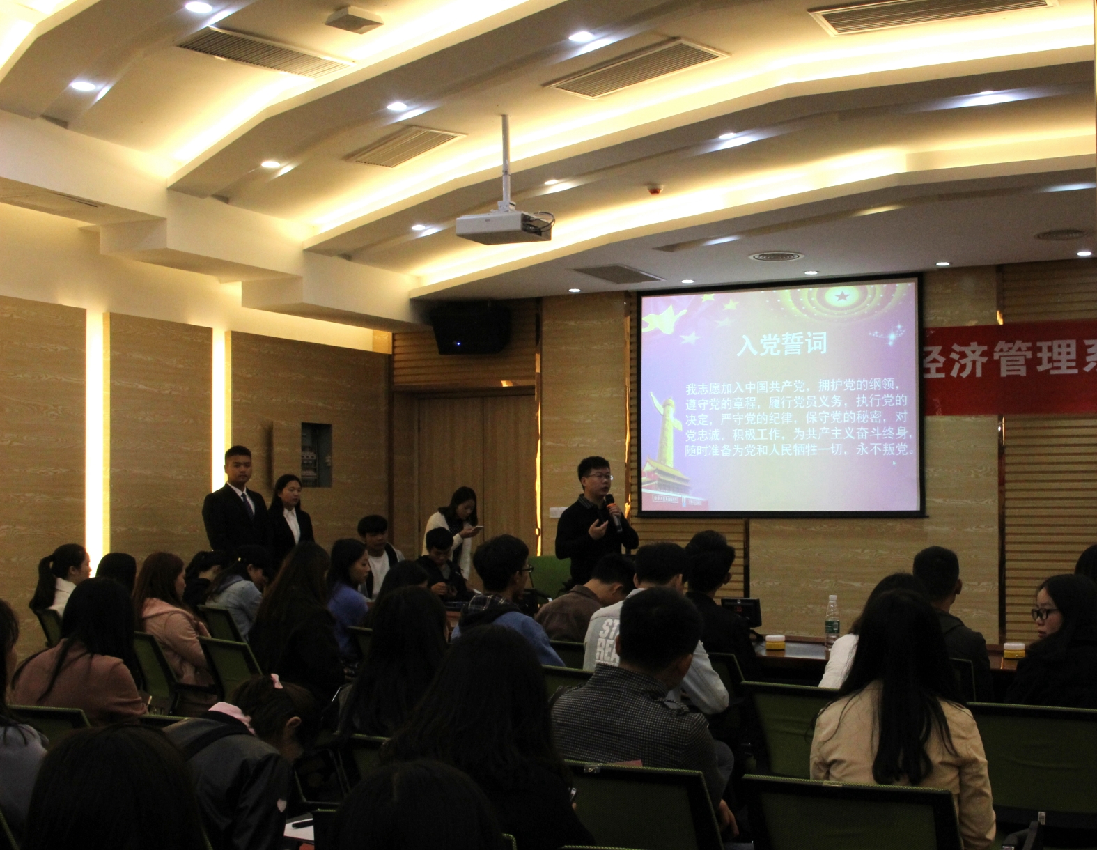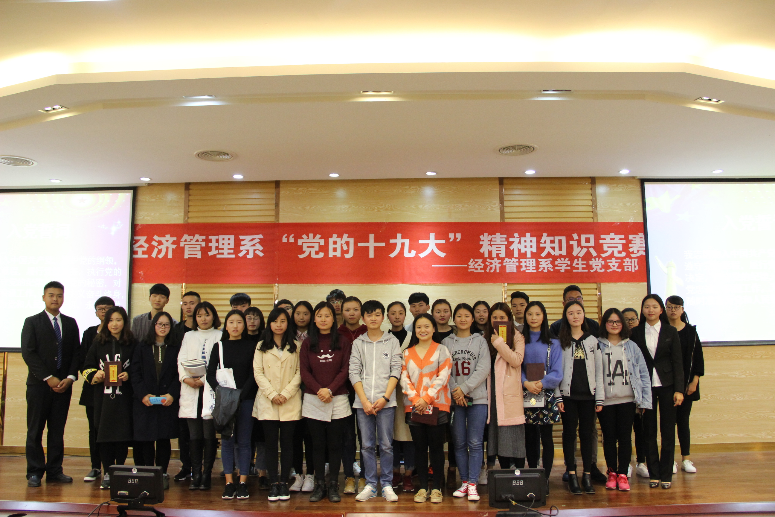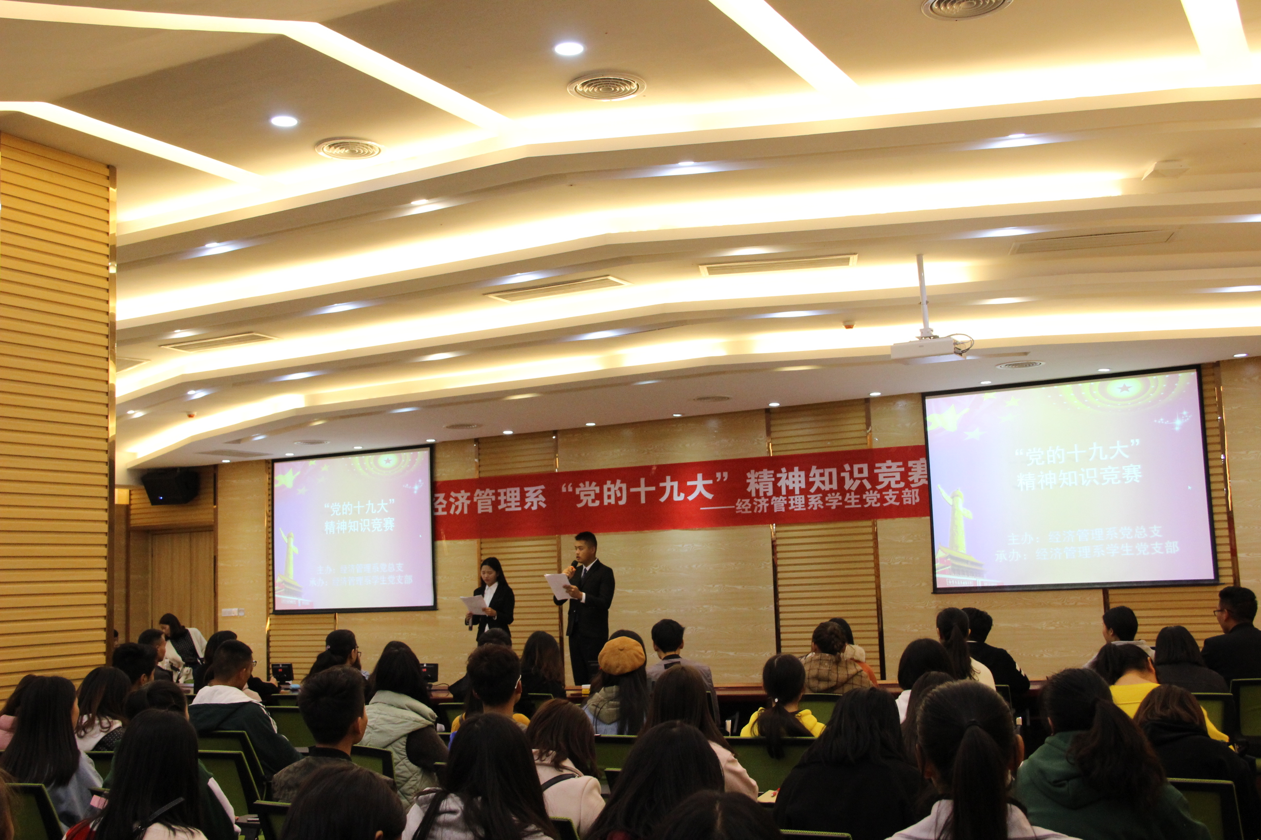 为了全面贯彻党的十九大精神,深入学习党章知识和习近平总书记系列重要讲话精神,推动“两学一做”学习教育常态化制度化,进一步加强基层组织和党员队伍建设,提升学生党员的整体素质,经济管理系学生支部于11月14日下午2点在学生事务中心二号报告厅开展了经济管理系“党的十九大精神”知识竞赛。