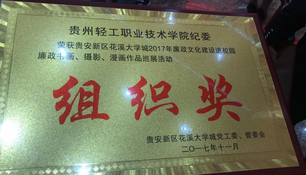 11月16日,学院纪委在贵安新区花溪大学城廉政文化建设进校园优秀书画巡展暨贵州财经大学第二届廉政主题书画展中,荣获贵安新区花溪大学城2017年廉政文化建设进校园廉政书画、摄影、漫画作品巡展活动组织奖。