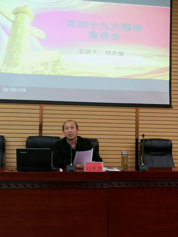 2017年11月28日,轻工化工系、保卫处、基建办在学生事务中心二号报告厅联合举办学习贯彻党的十九大精神宣讲会,本次宣讲会由学院党委委员、副院长刘天德担任主讲人,三个部门全体党员、教职工以及轻工化工系学生代表参加本次活动。