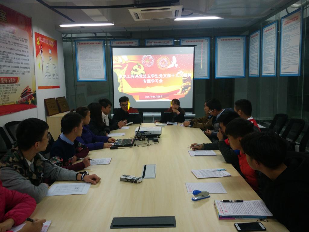 2017年11月29日晚上,机电工程系党总支学生党支部全体党员在系部会议室召开会议集体专题学习十九大精神。专题学习会由机电工程系党总支书记陈霁主讲。